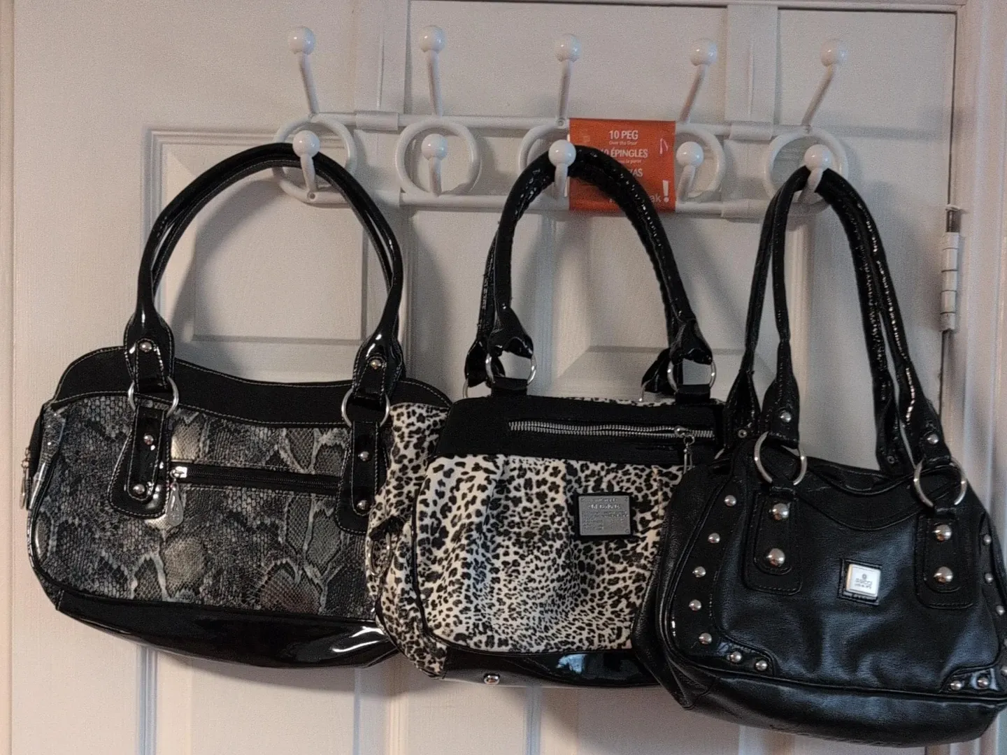 Bundle of three stylish women's handbags. Features various patterns including snakeskin and leopard print, alongside a classic black studded design. Multiple compartments for organization.