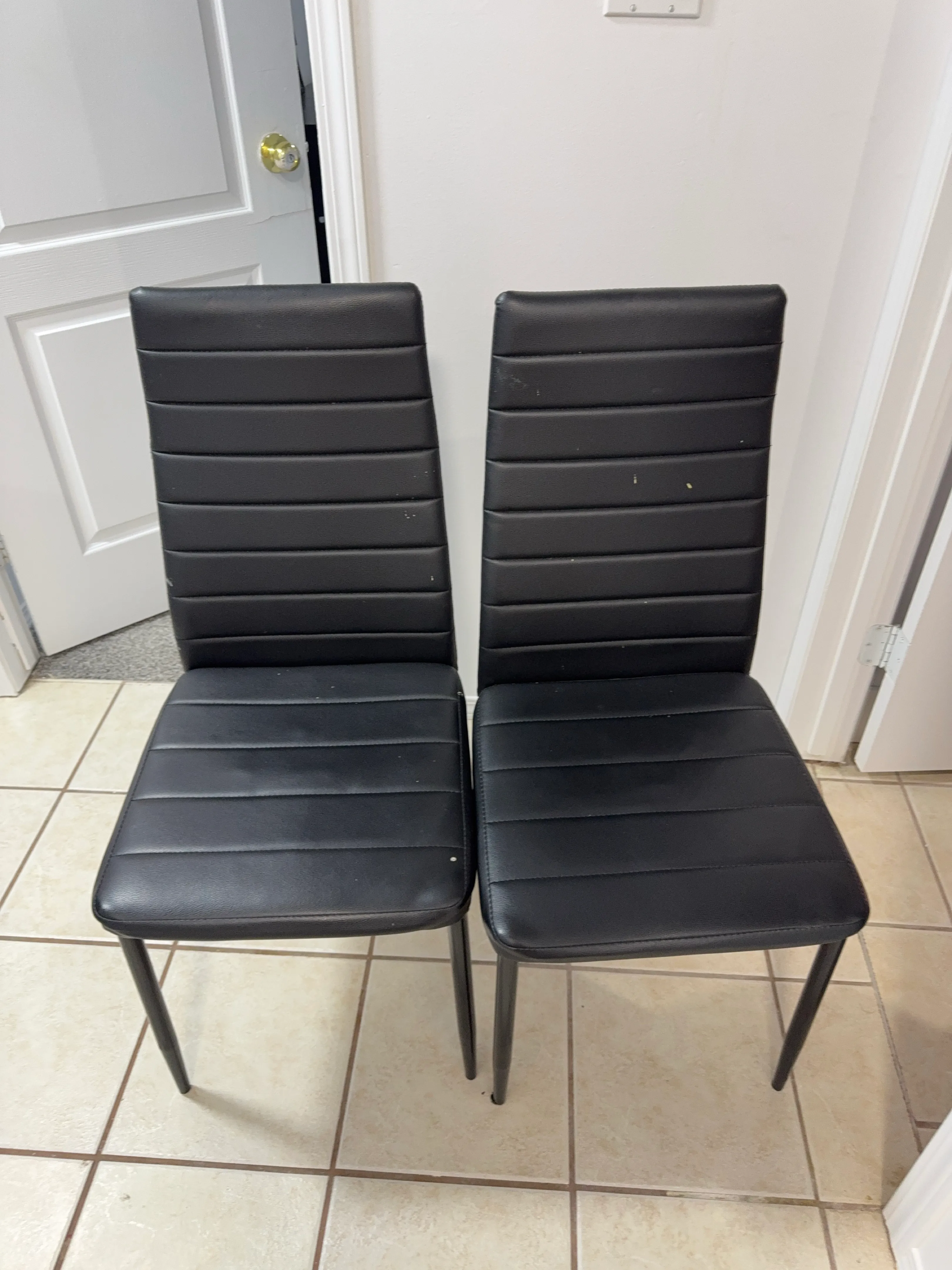 Selling dinning table with three black dining chairs. These chairs are upholstered in faux leather with a modern design. They're suitable for a dining room or kitchen.