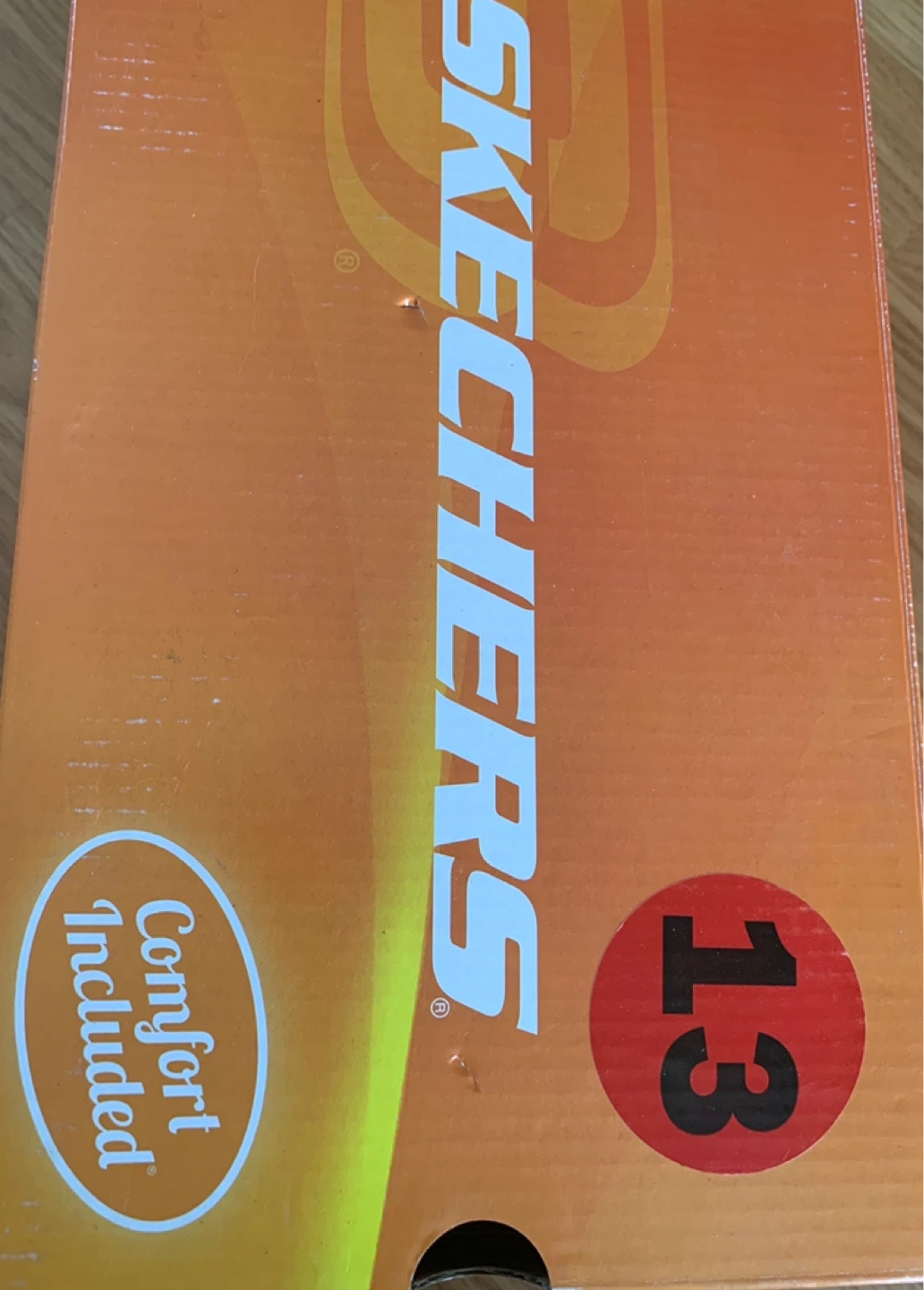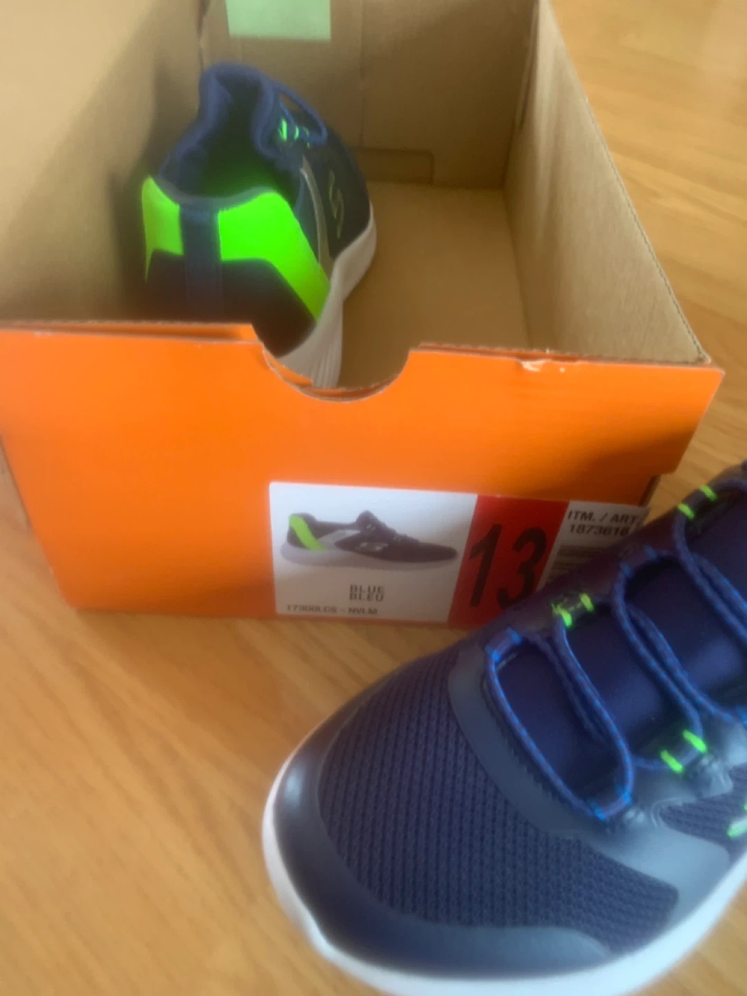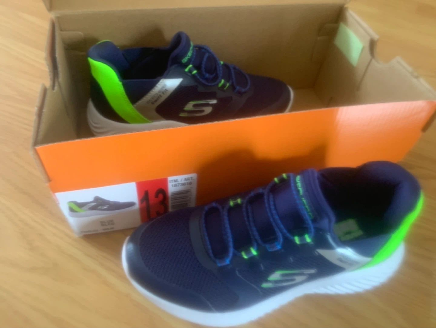 These are Skechers kids running shoes in a size 13. They are a dark blue with neon green accents and feature adjustable straps. They're great for active kids on the go!