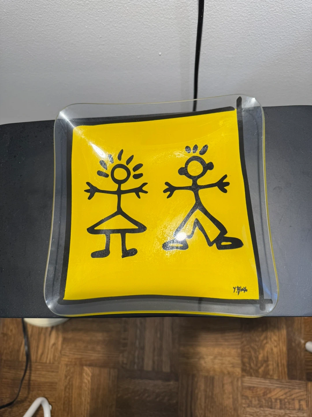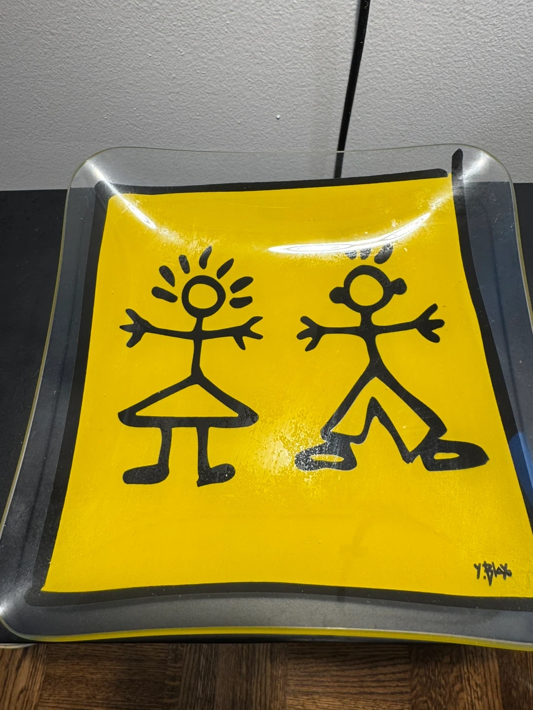 A cute square glass tray featuring a bright yellow background with black stick figures of a girl and a boy. It's signed by the artist 'Y.Bax' in the corner. This decorative piece is perfect for holding small trinkets or keys.