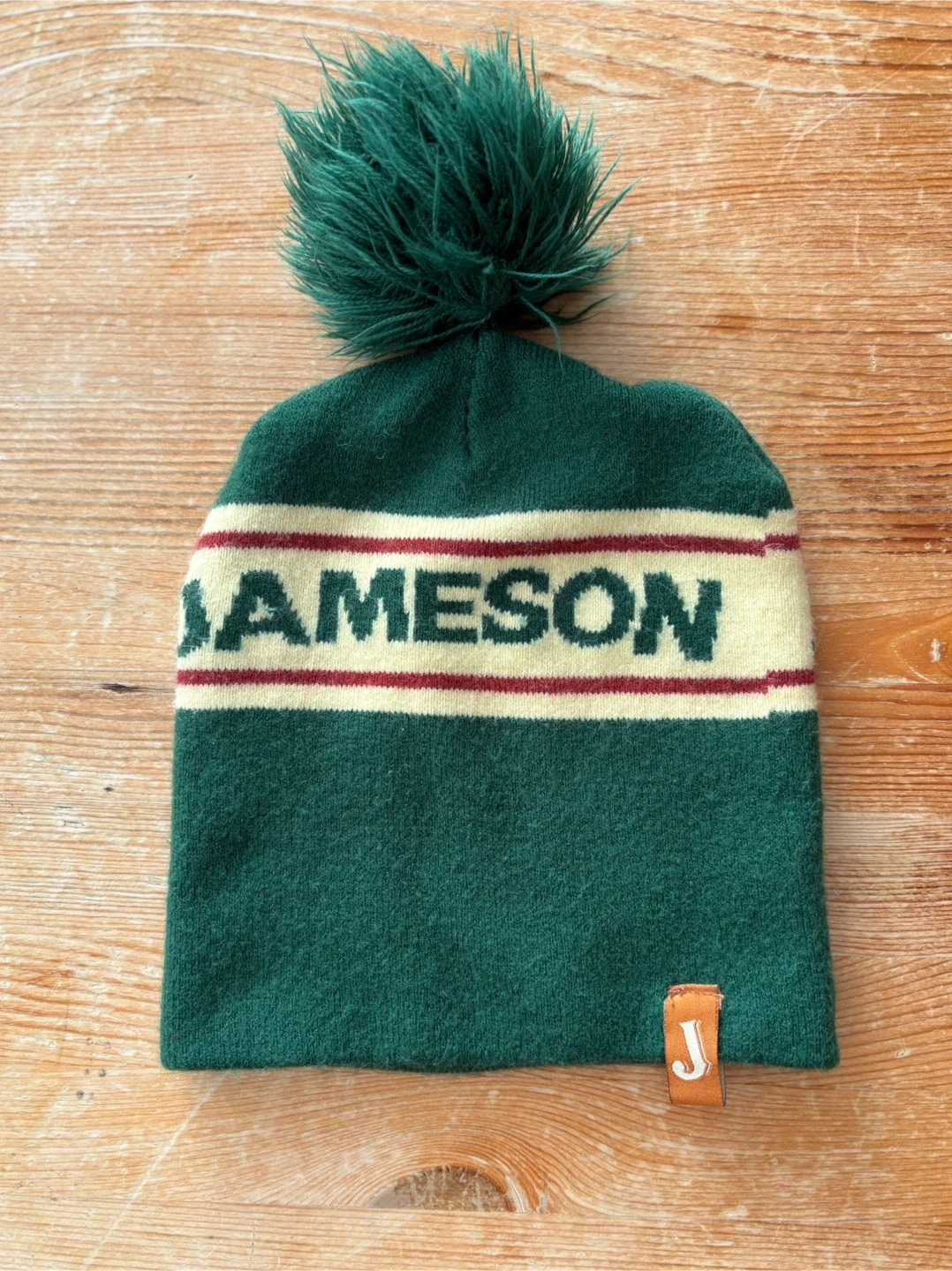 Green Jameson knit beanie with a green pom. It features a cream stripe with red trim and 'JAMESON' text. Small 'J' tag on the side. Perfect for staying warm!