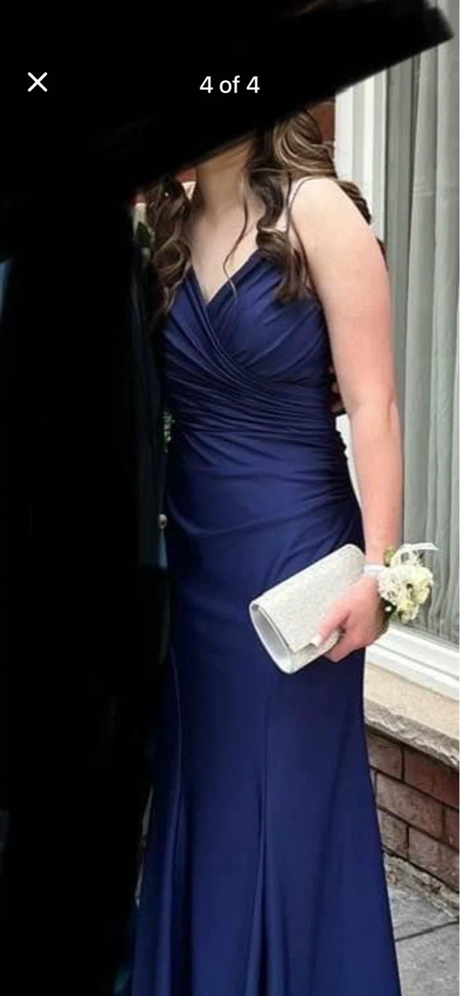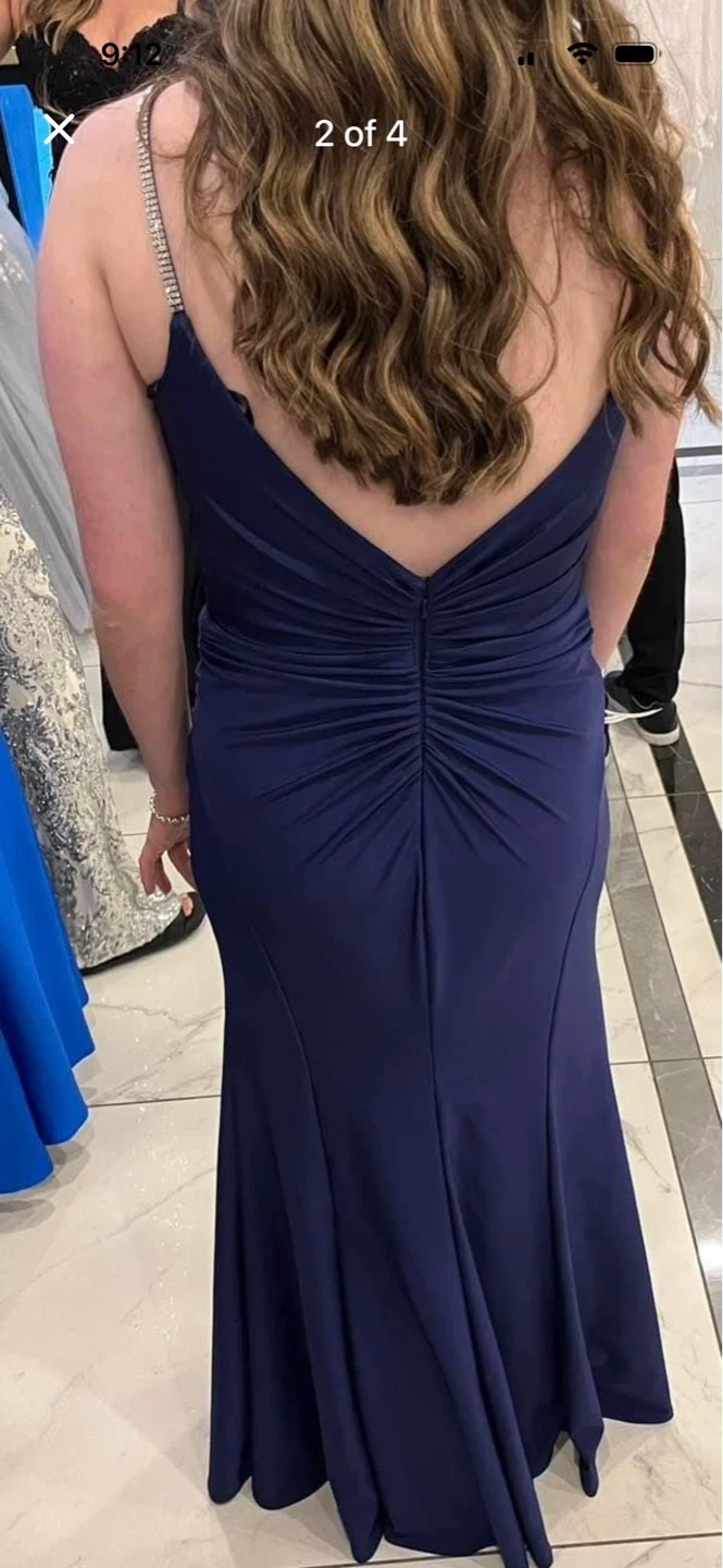 Stunning navy blue formal gown with a flattering ruched bodice and a mermaid-style skirt. It features delicate rhinestone straps for a touch of sparkle. This dress is perfect for a prom or special occasion!