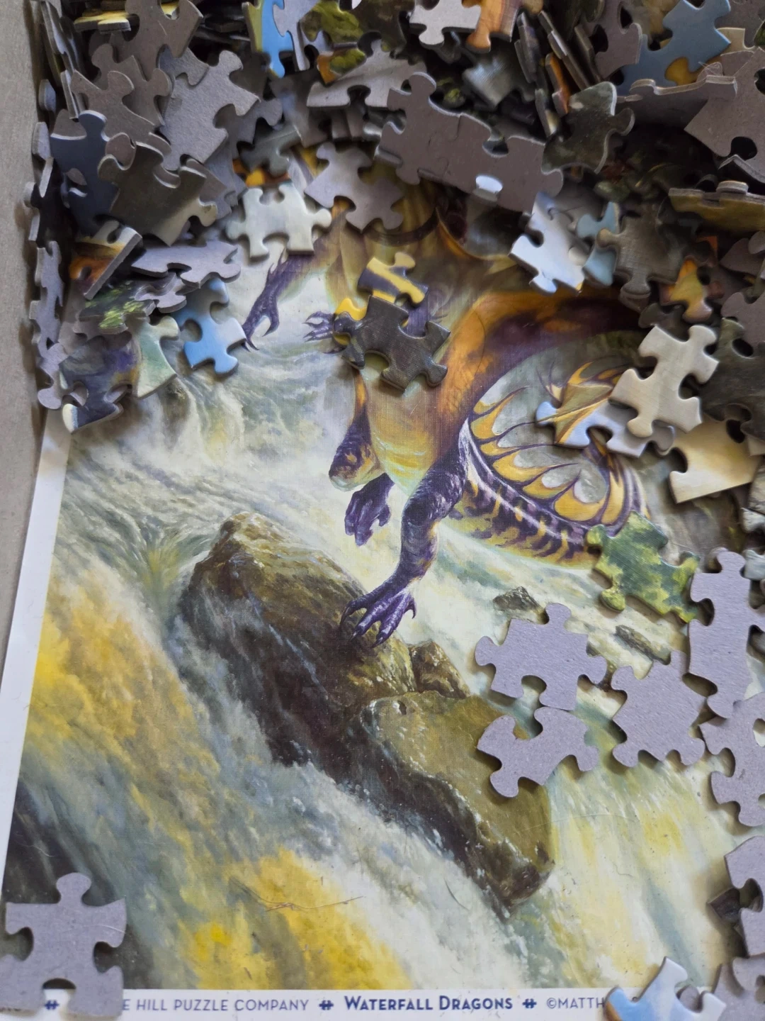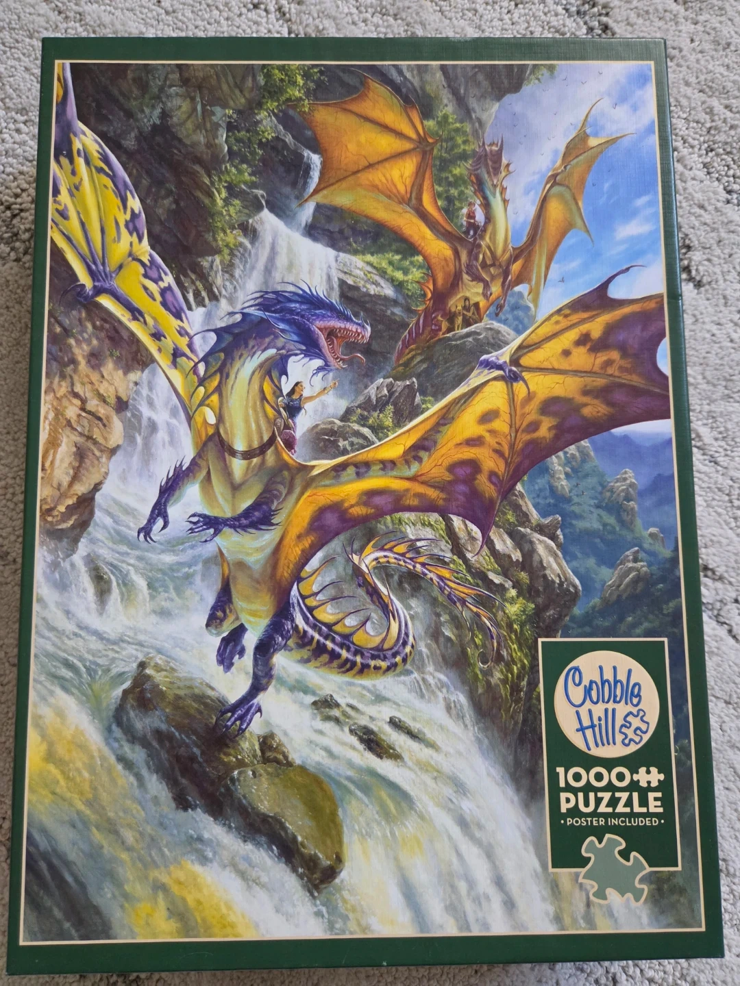 This Cobble Hill puzzle features a "Waterfall Dragons" design with vibrant artwork. It's a 1000-piece set and includes a poster, all pieces are included