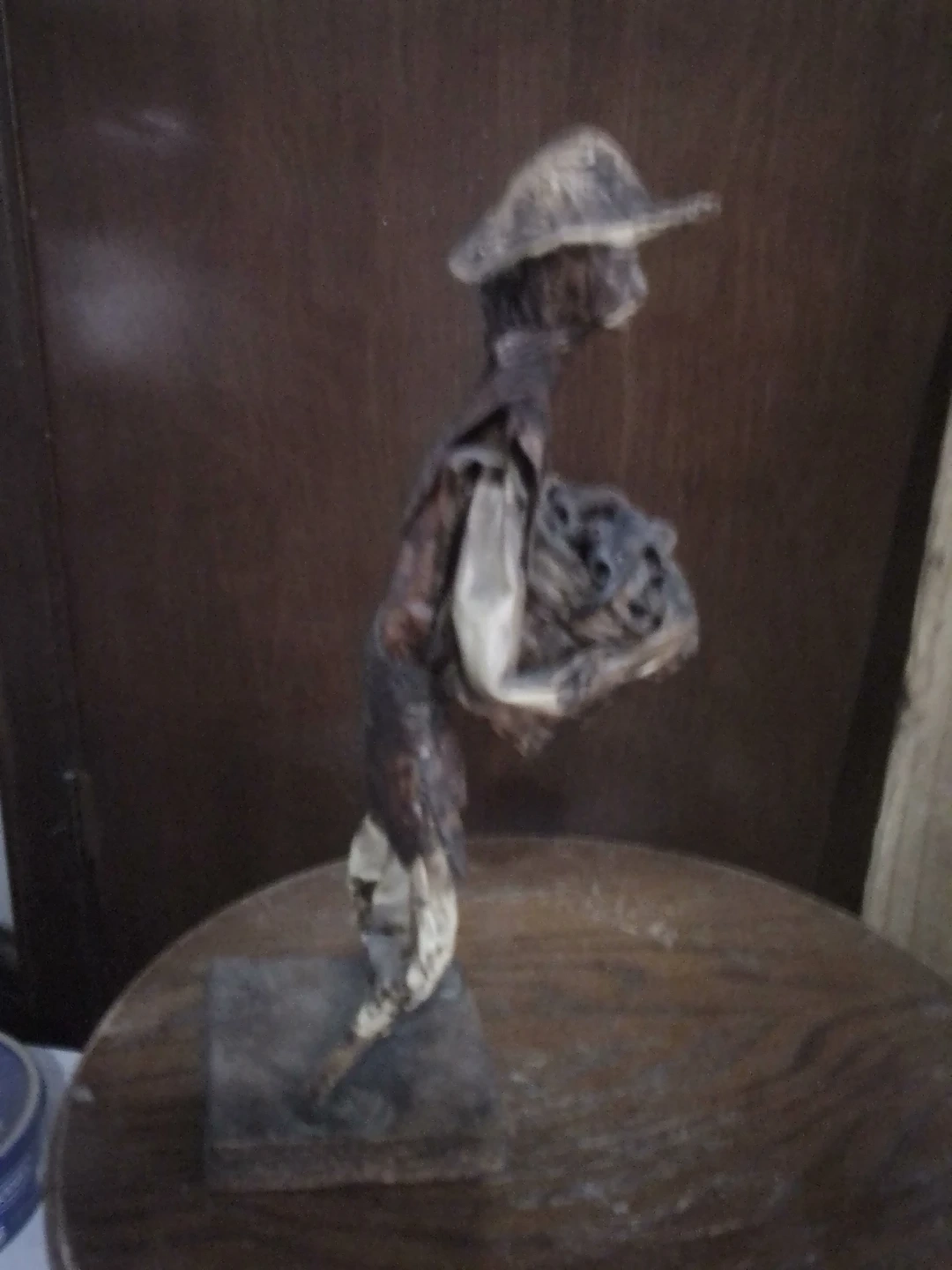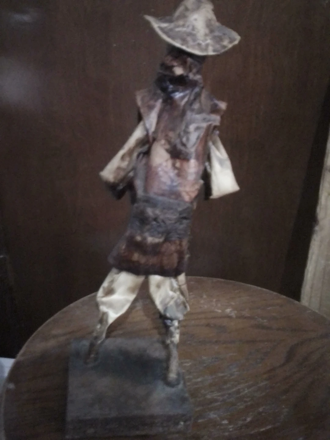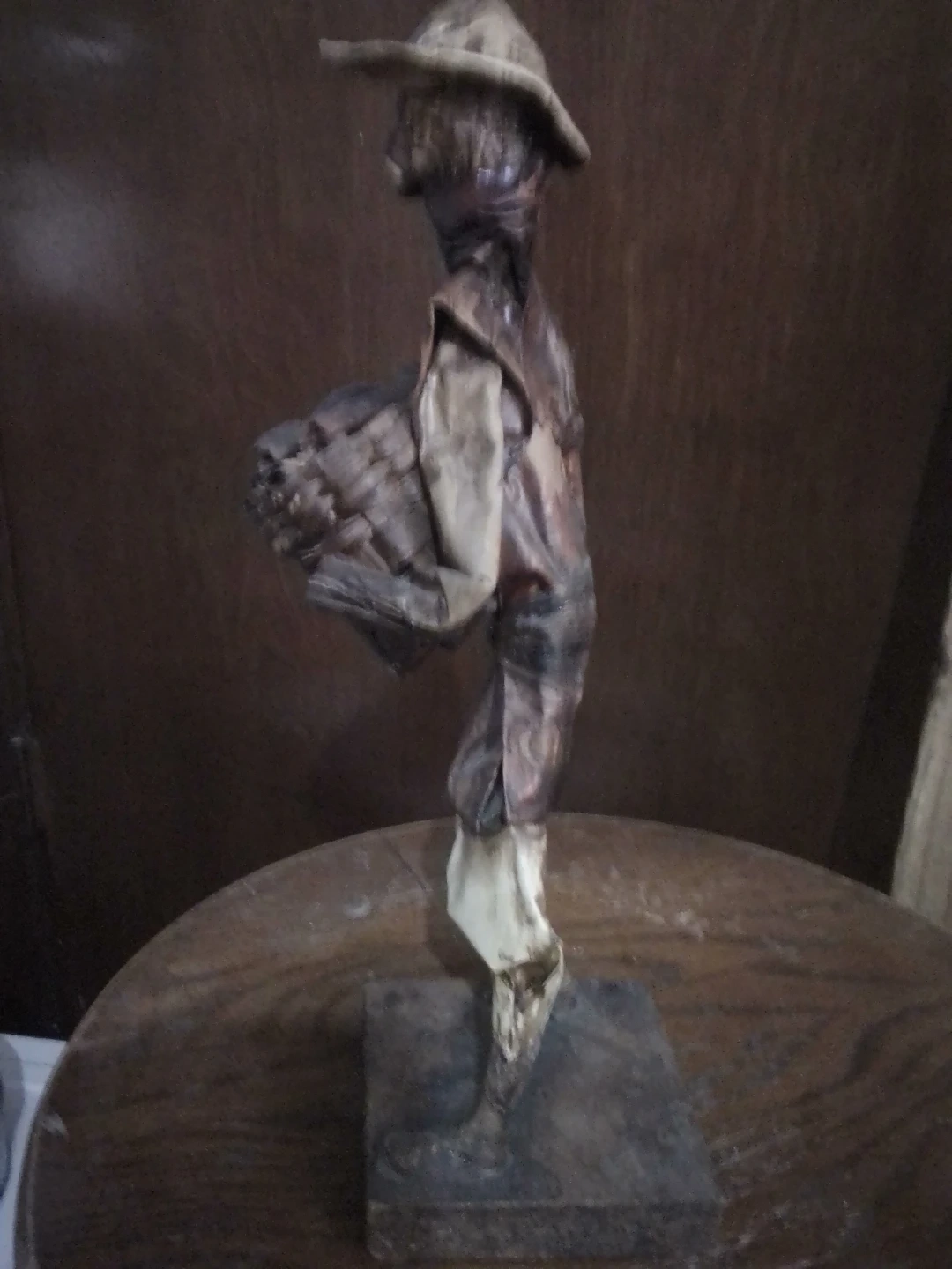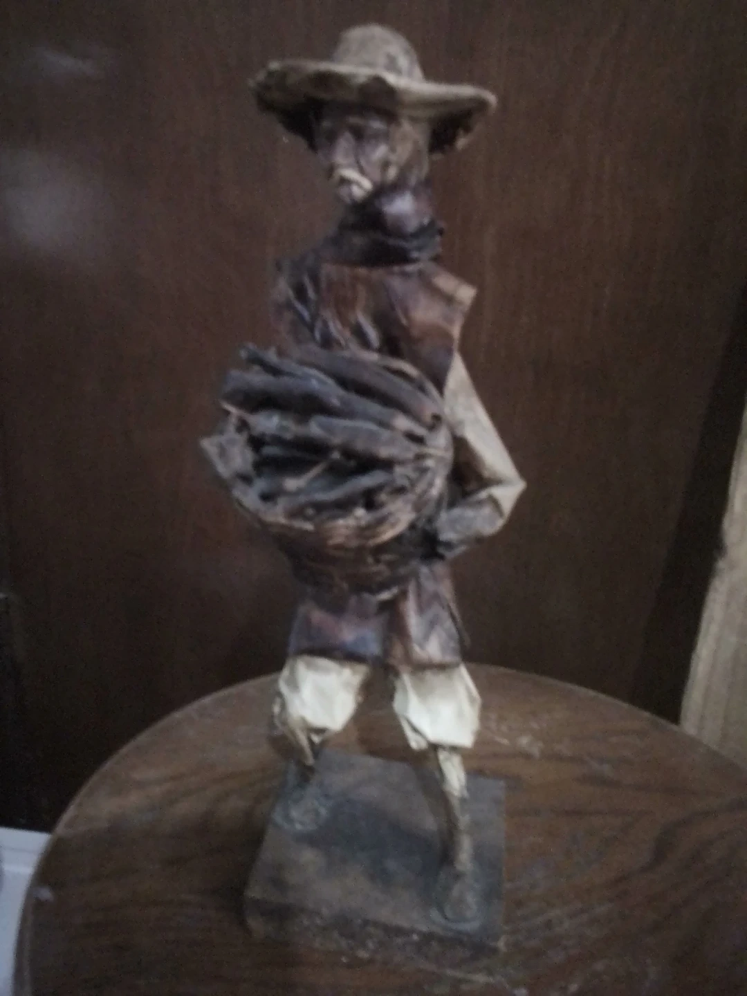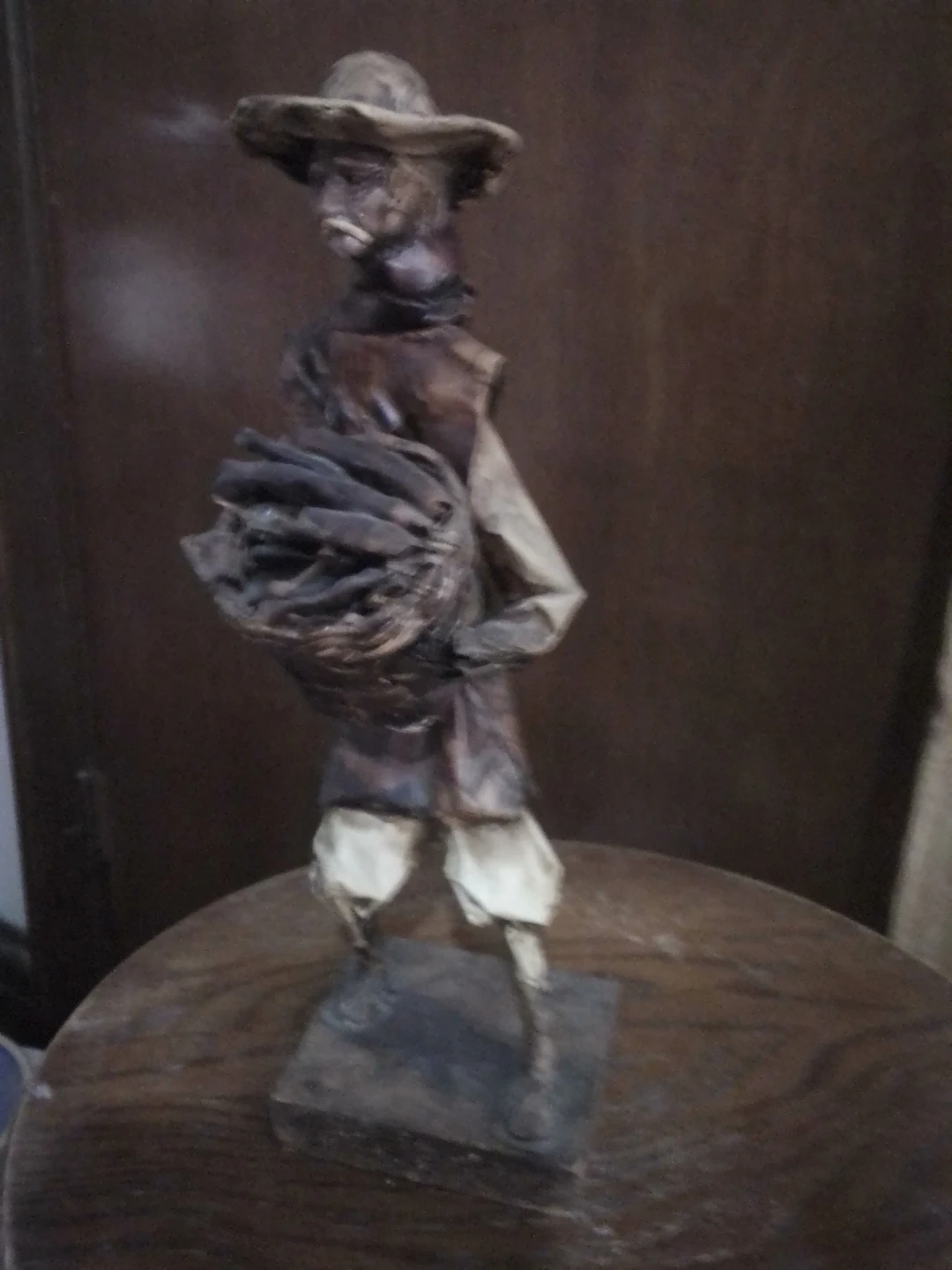 This is a handmade folk art figure. It depicts a person wearing a hat and carrying a basket. The figure is mounted on a base.