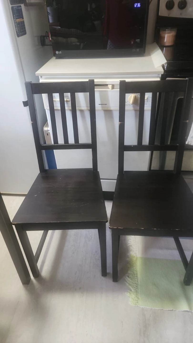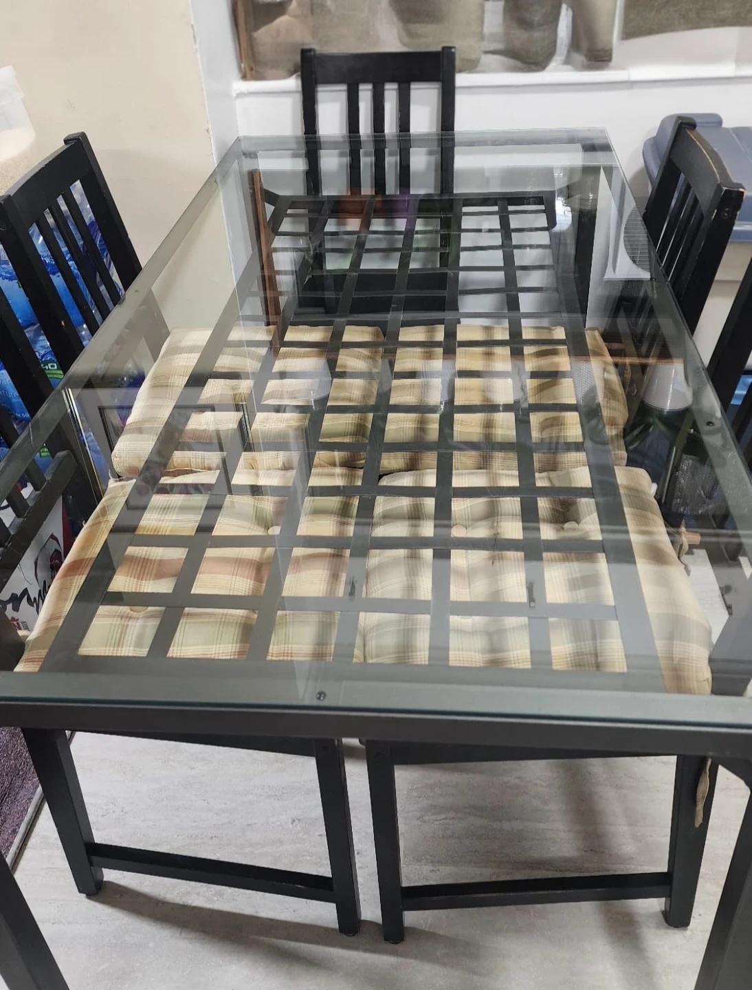 Selling a dining table with a glass top with metal frame legs and x6 wooden chairs with cushions.