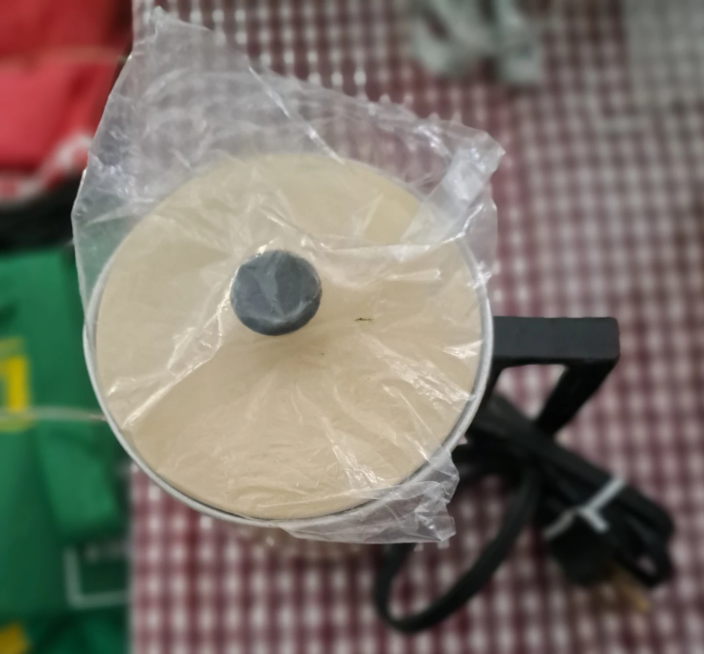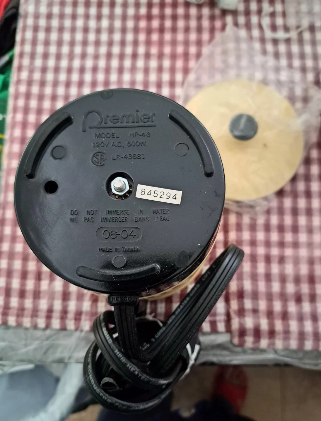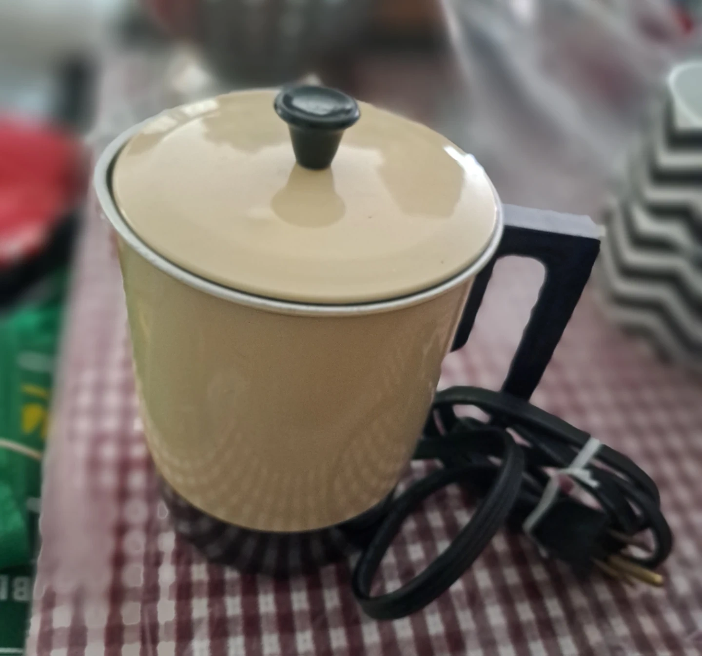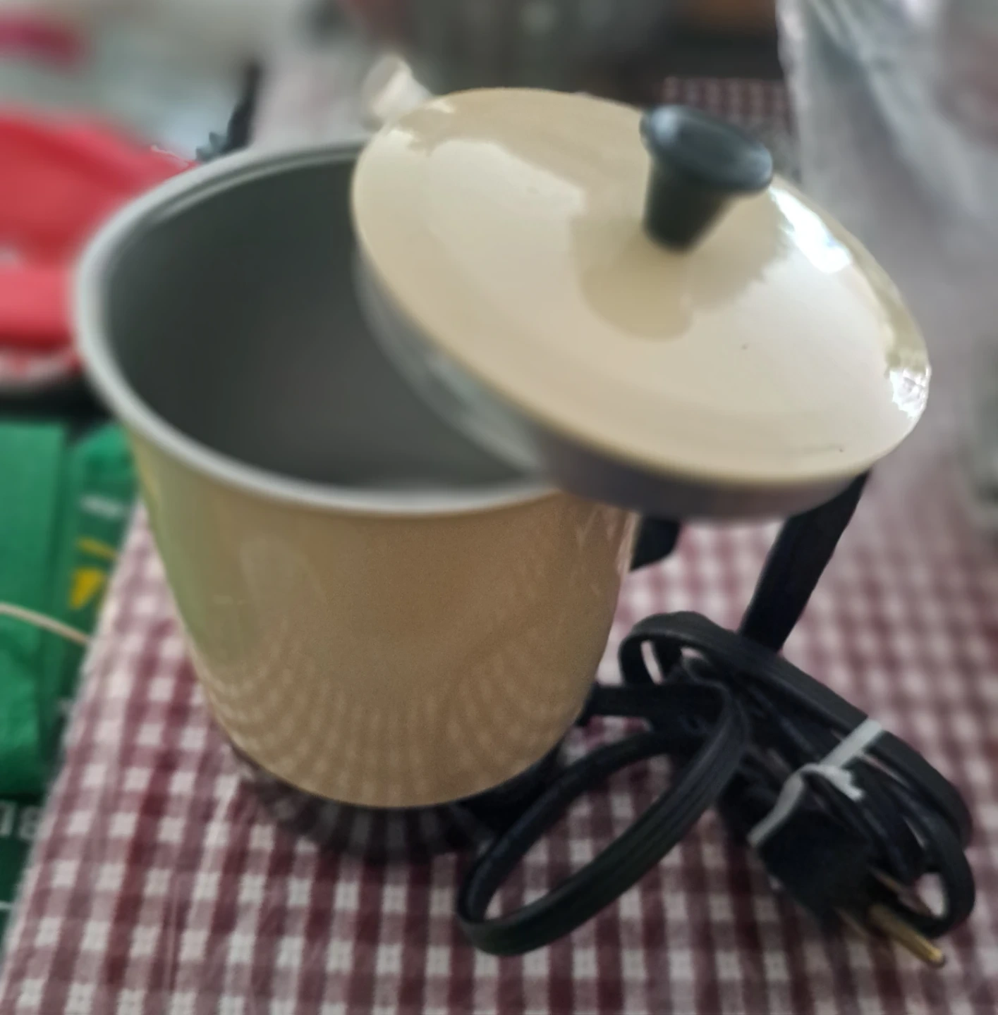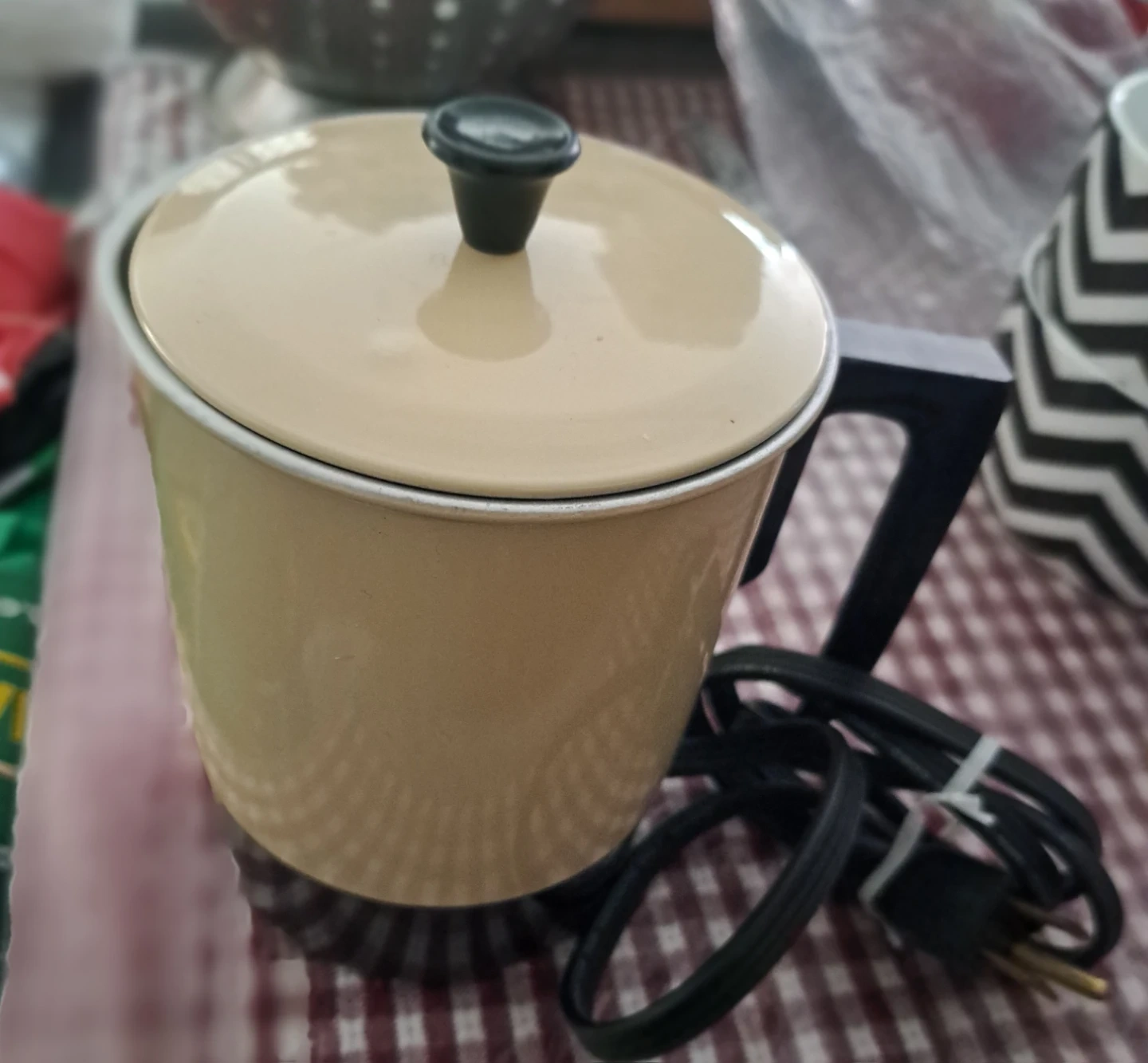 This is a vintage Premier electric pot. It's a cream colour with a black handle and lid knob. The interior appears to be aluminum.