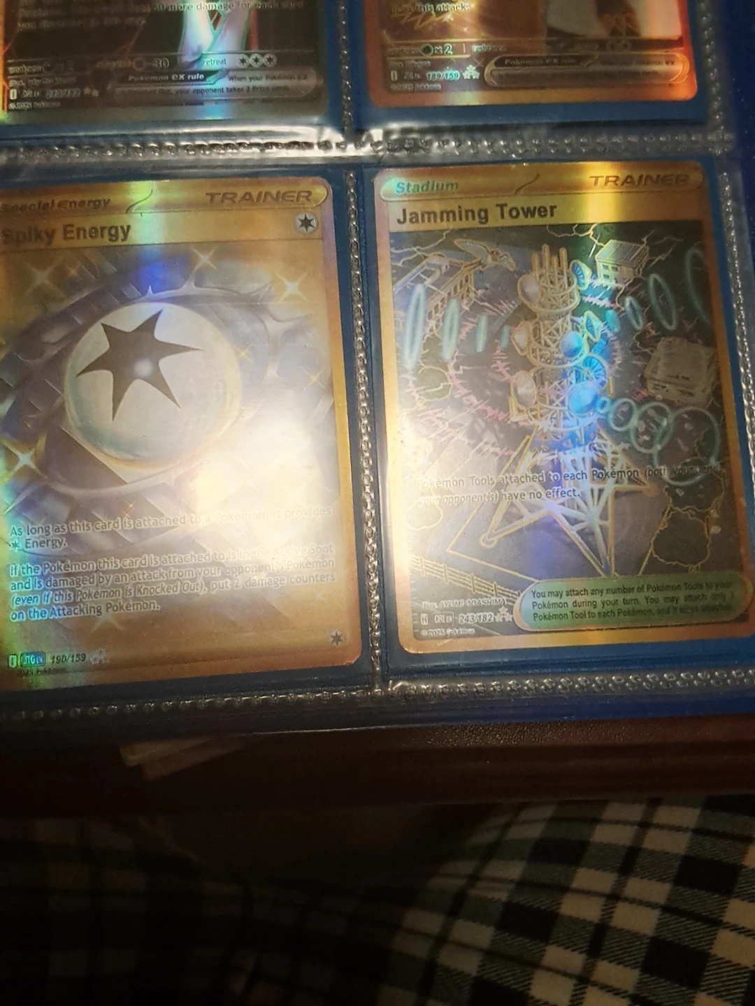 Selling two rare Pokemon trading cards: a Spiky Energy Special Energy card and a Jamming Tower Trainer card. Both feature a golden, shiny design. These are trainer cards from the Pokemon TCG.