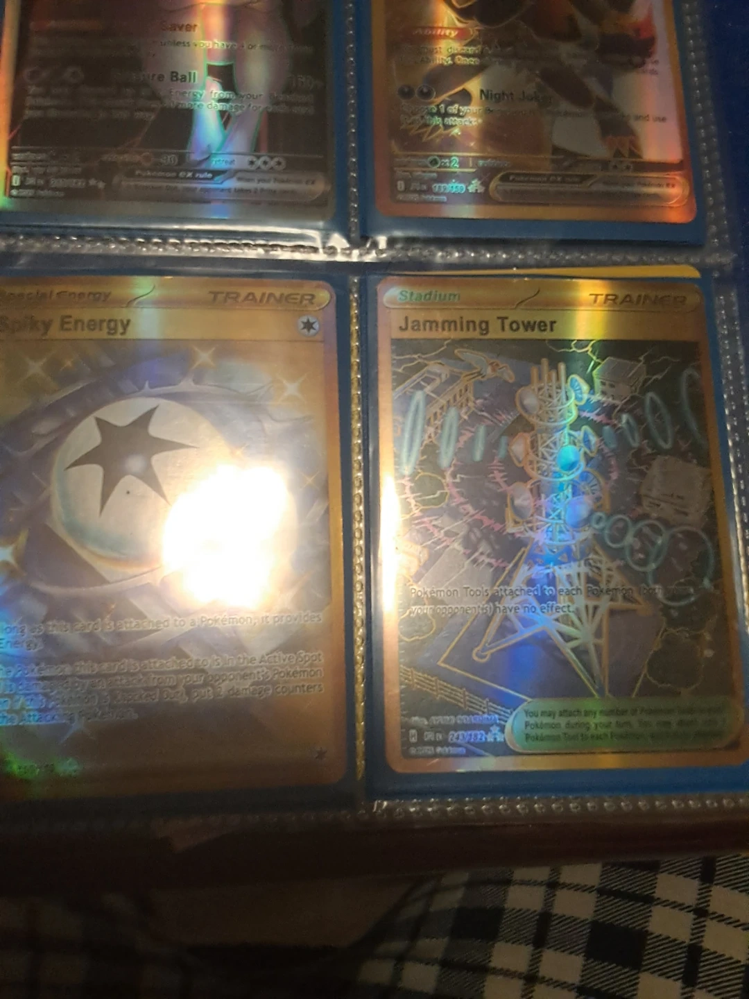 Selling two rare Pokemon trading cards: a Spiky Energy Special Energy card and a Jamming Tower Trainer card. Both feature a golden, shiny design. These are trainer cards from the Pokemon TCG.