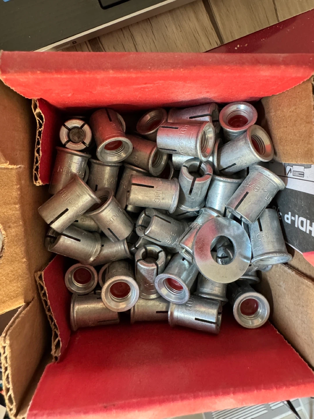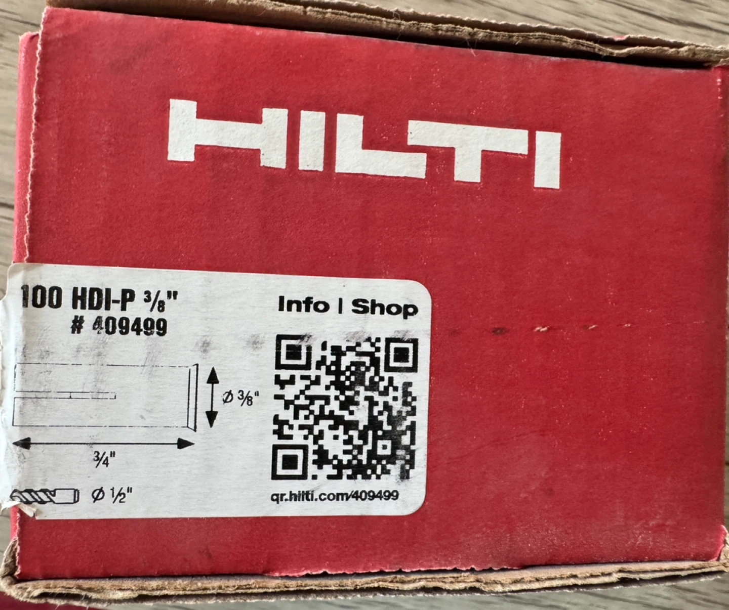 Selling a box of Hilti 100 HDI-P 3/8" anchors. The box includes the anchors as shown in the pictures. (73 pieces left in box)