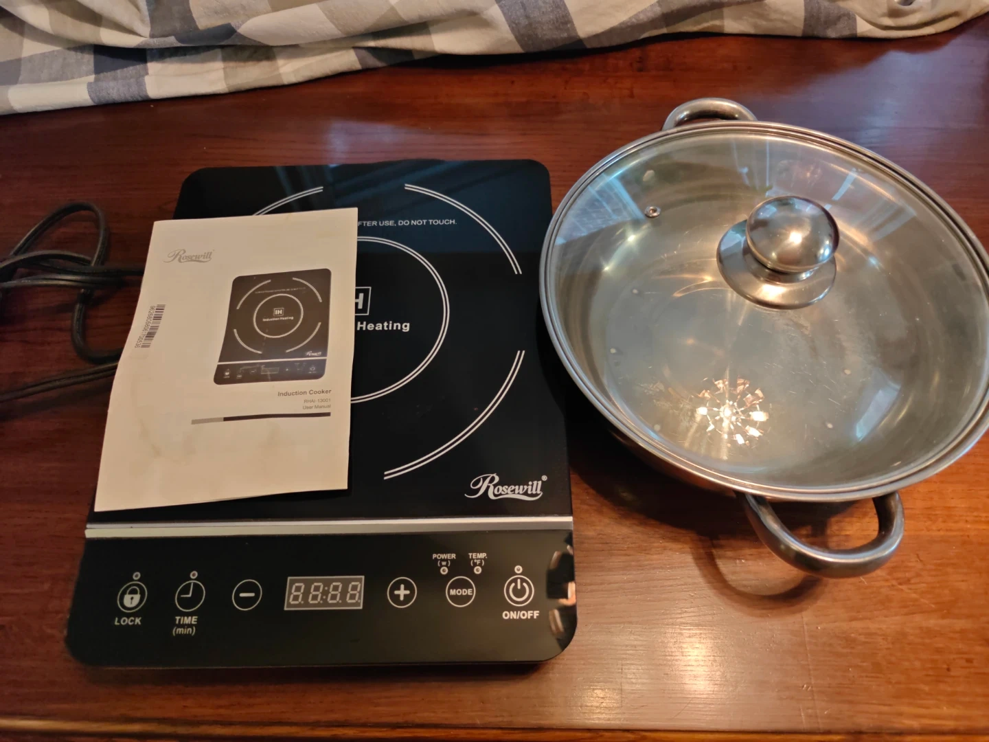 Perfect for tabletop hotpot! Rosewill induction cooker with a stainless steel pot and glass lid. Features digital display with time and temperature controls. Includes user manual.