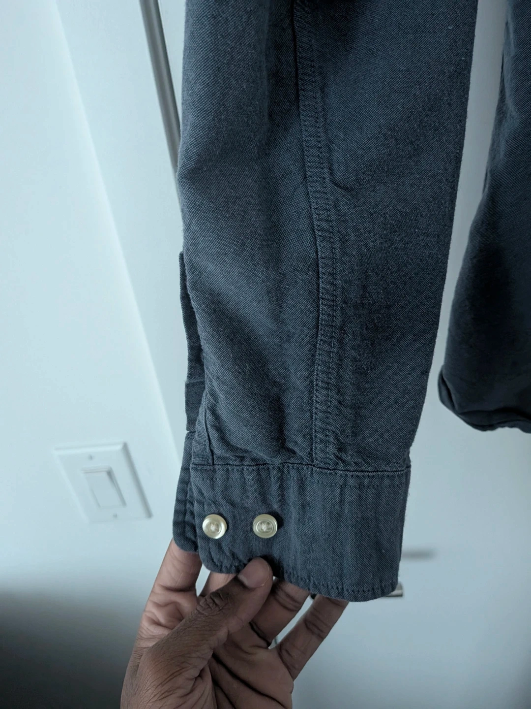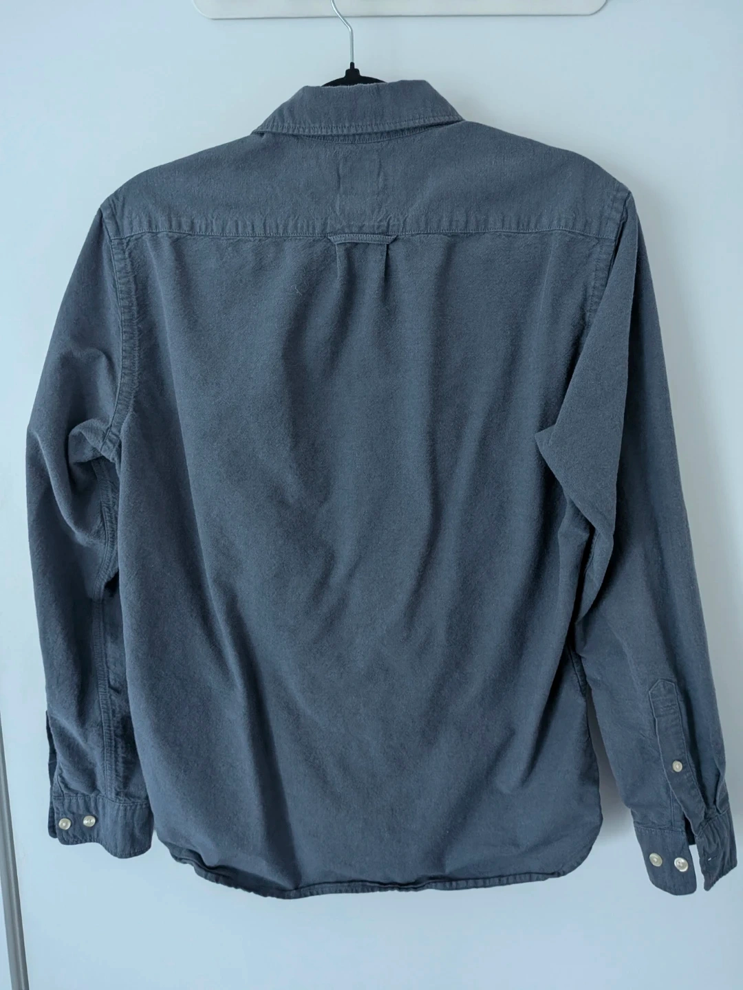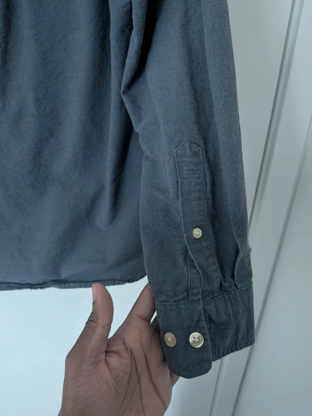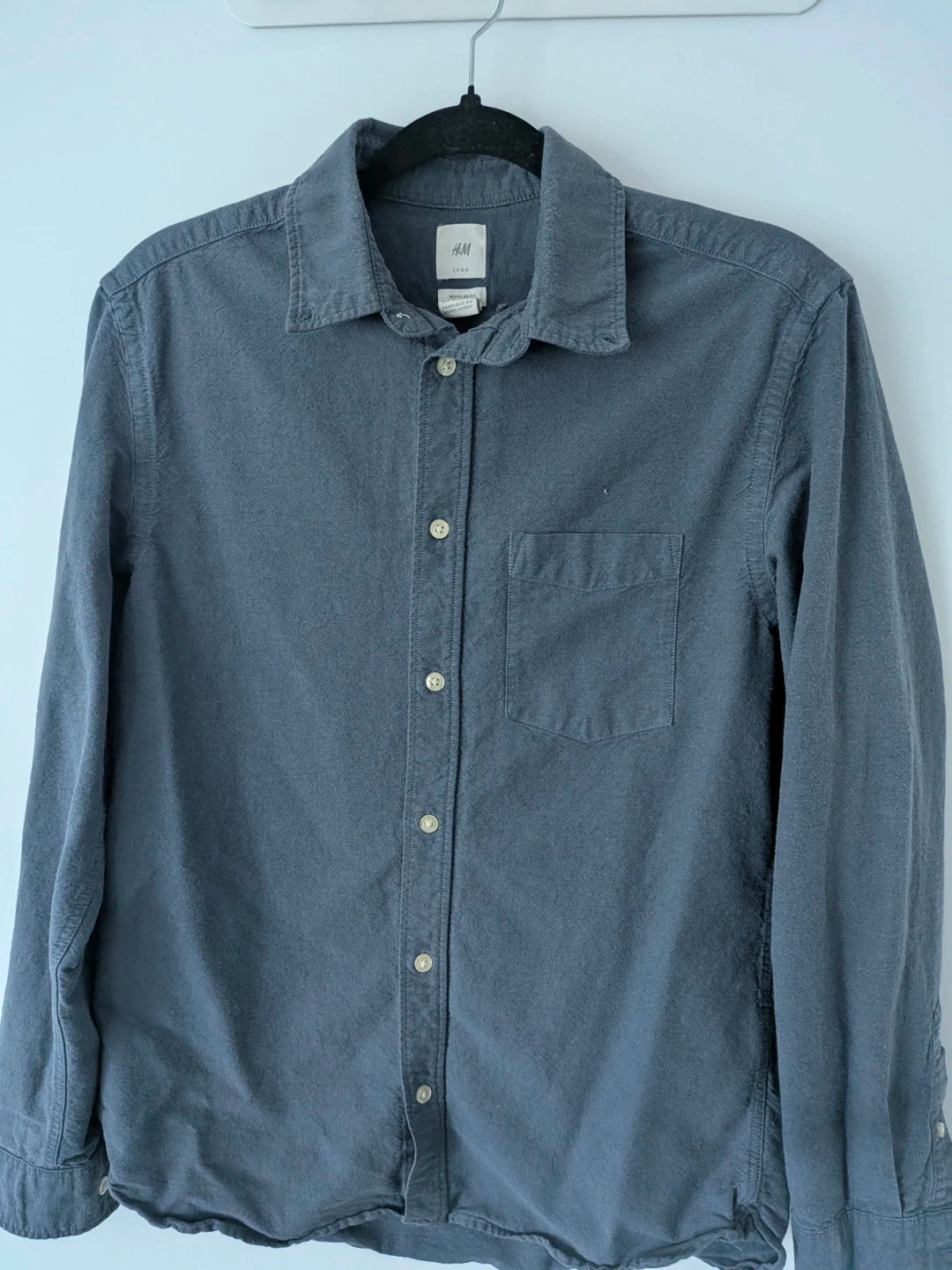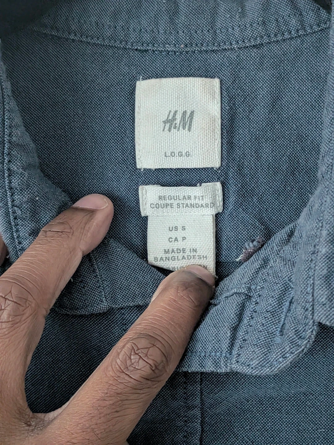 Grey H&M LOGG long-sleeve button-up shirt. Regular fit, size US S. Made in Bangladesh. Cotton blend fabric.