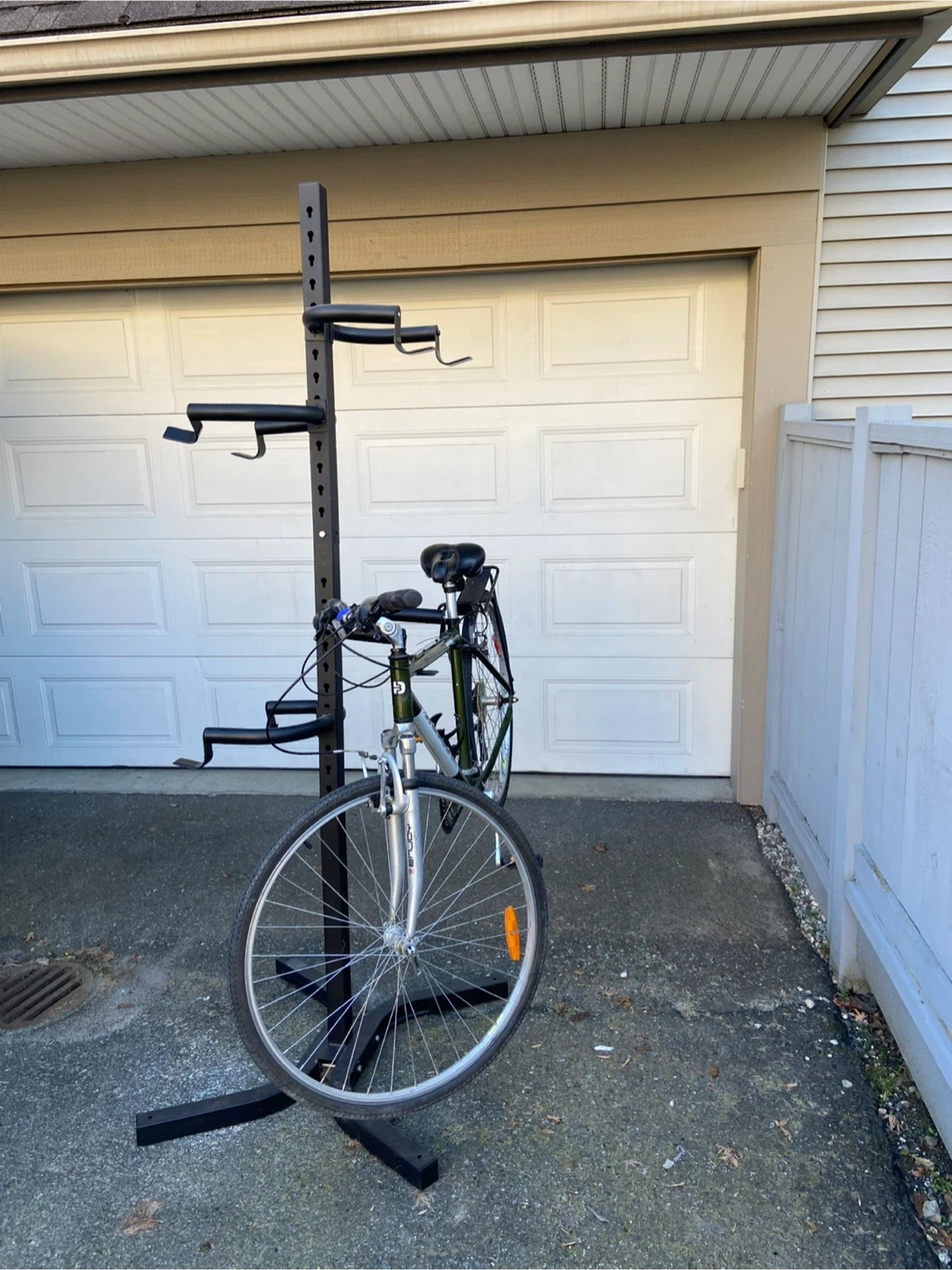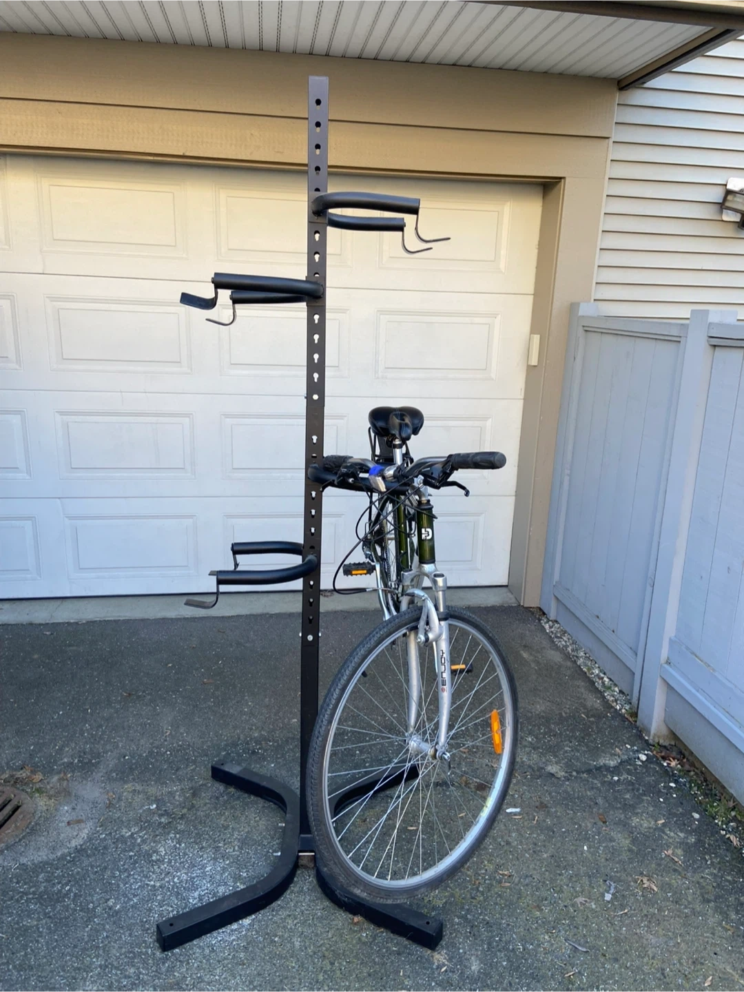 This is a black metal bike storage rack. It holds 4 bikes, adjustable heights for each rack. Can bolt to floor. It's a great way to save space in your garage or shed!