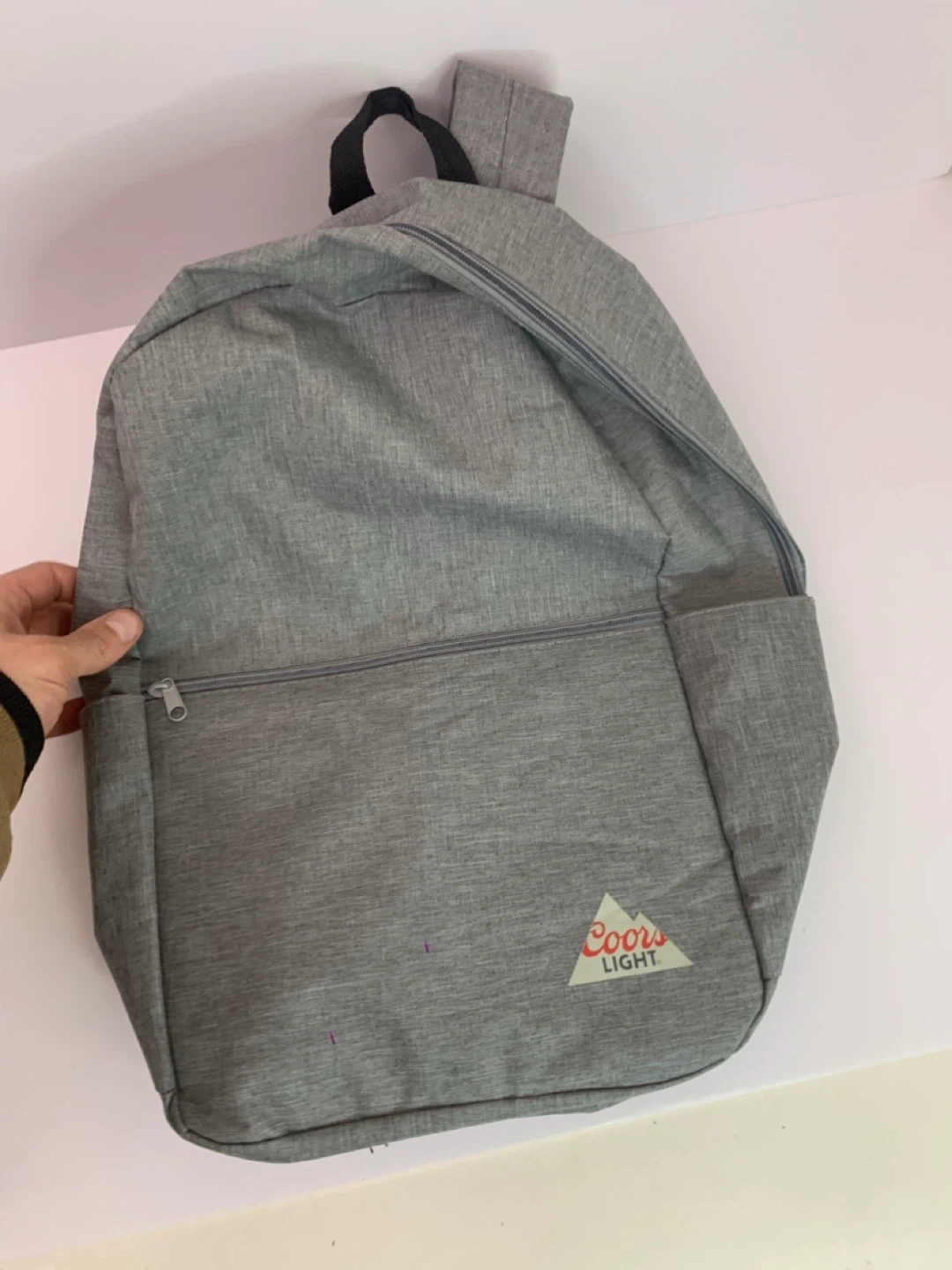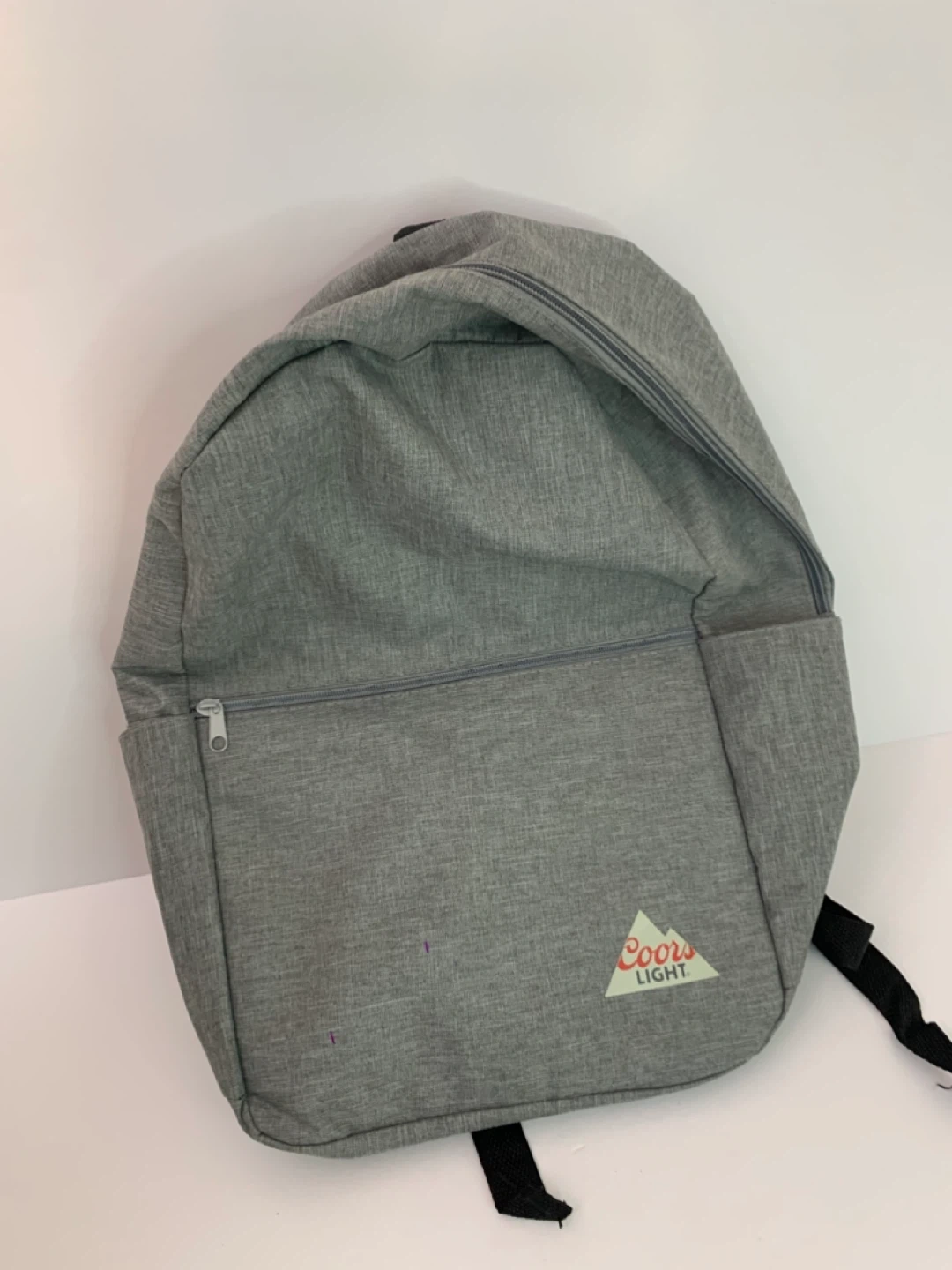 Grey backpack with the Coors Light logo. It has a zippered main compartment and a front pocket. The interior is lined.