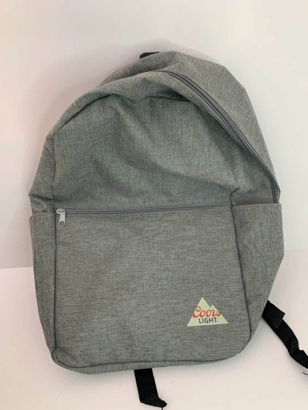 Grey backpack with the Coors Light logo. It has a zippered main compartment and a front pocket. The interior is lined.
