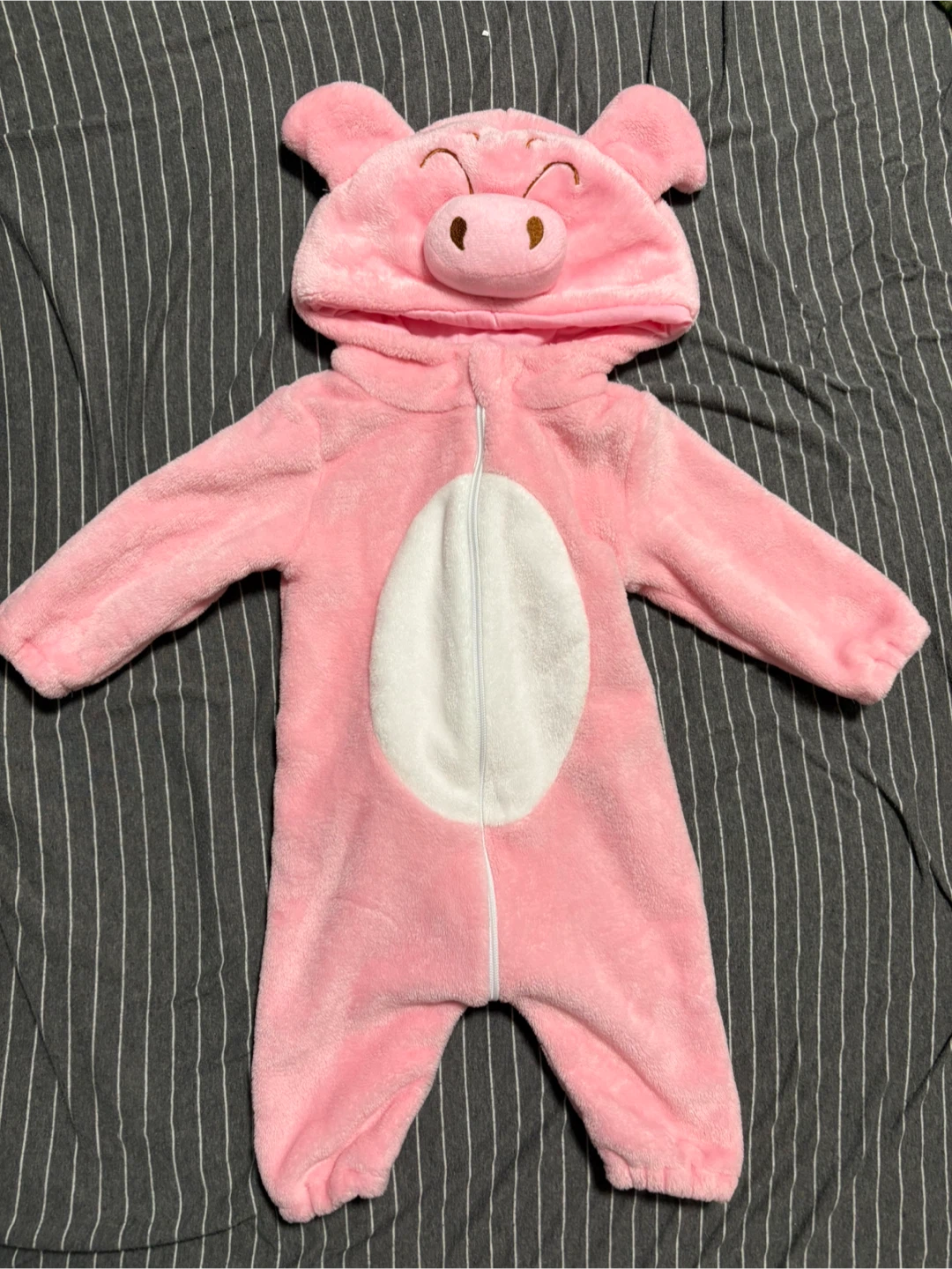 Super cute pink pig costume with curly tail for your little one! It's size 70, which fits babies around 0-5 months old or 23-27 inches in height.
