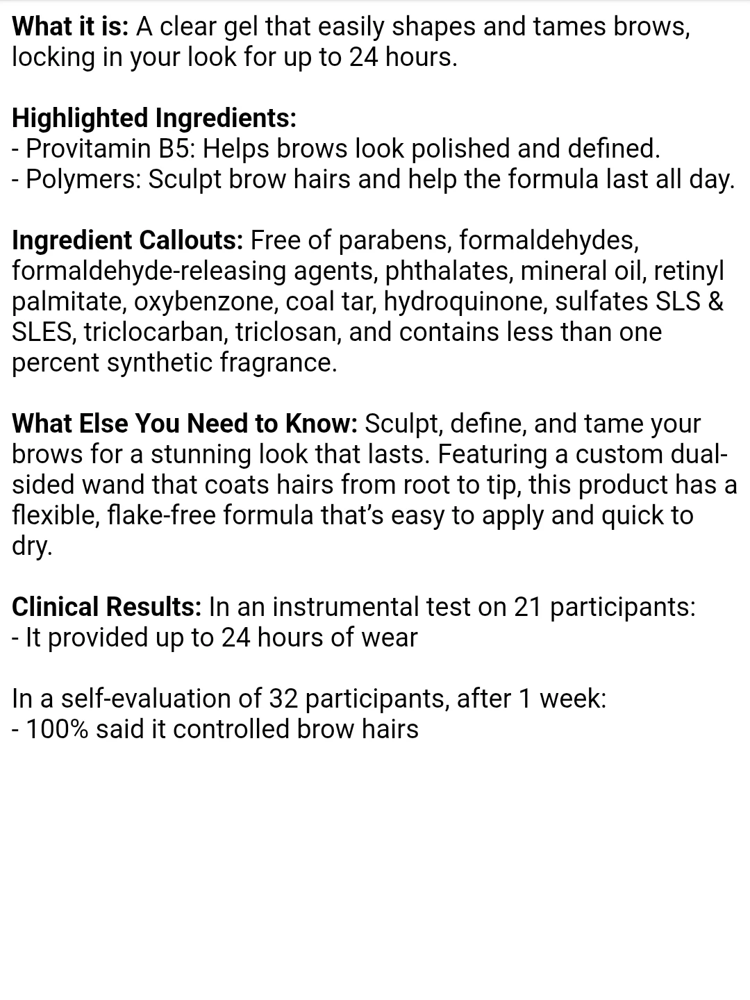 Benefit's 24-HR Brow Setter is a clear invisible shaping and setting gel for brows. It locks your brow look in place for up to 24 hours with a flexible, flake-free formula. This product includes a custom dual-sided wand that coats hairs from root to tip.