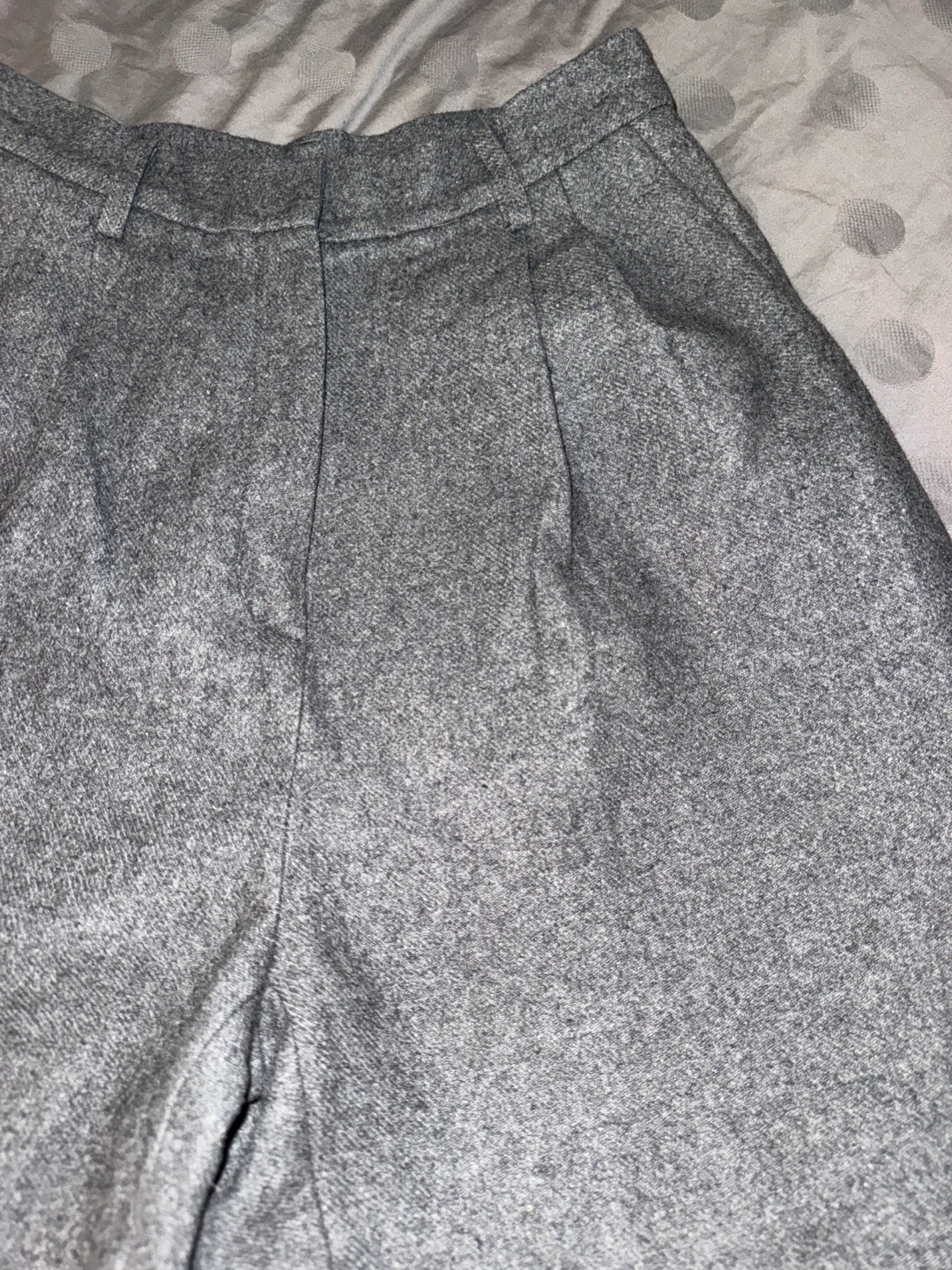 Grey wide leg trousers. Wool blend material. High-waisted with a pleated front and belt loops. Two side pockets and two back welt pockets.