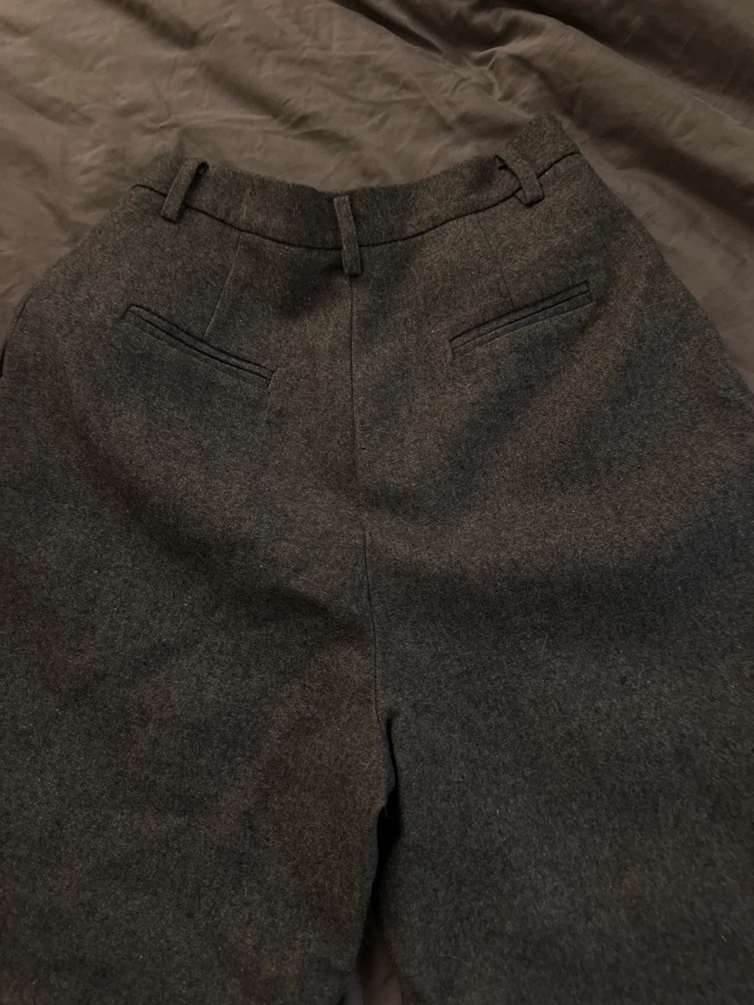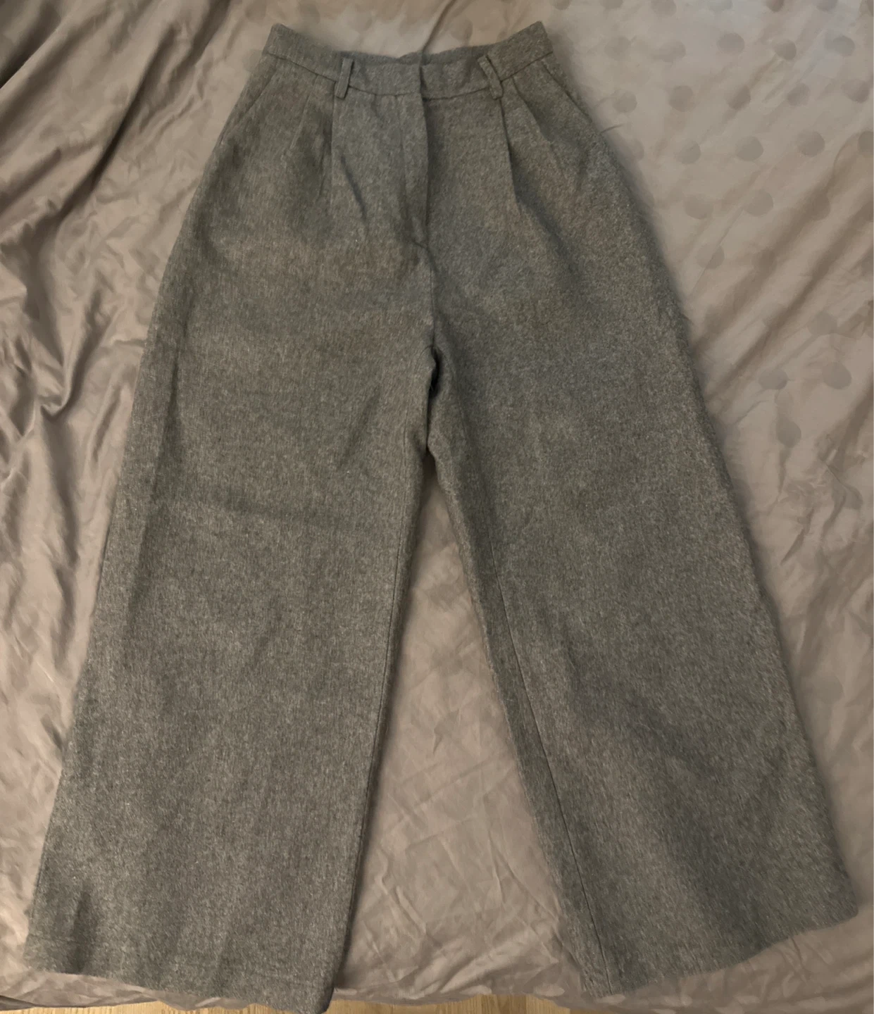 Grey wide leg trousers. Wool blend material. High-waisted with a pleated front and belt loops. Two side pockets and two back welt pockets.