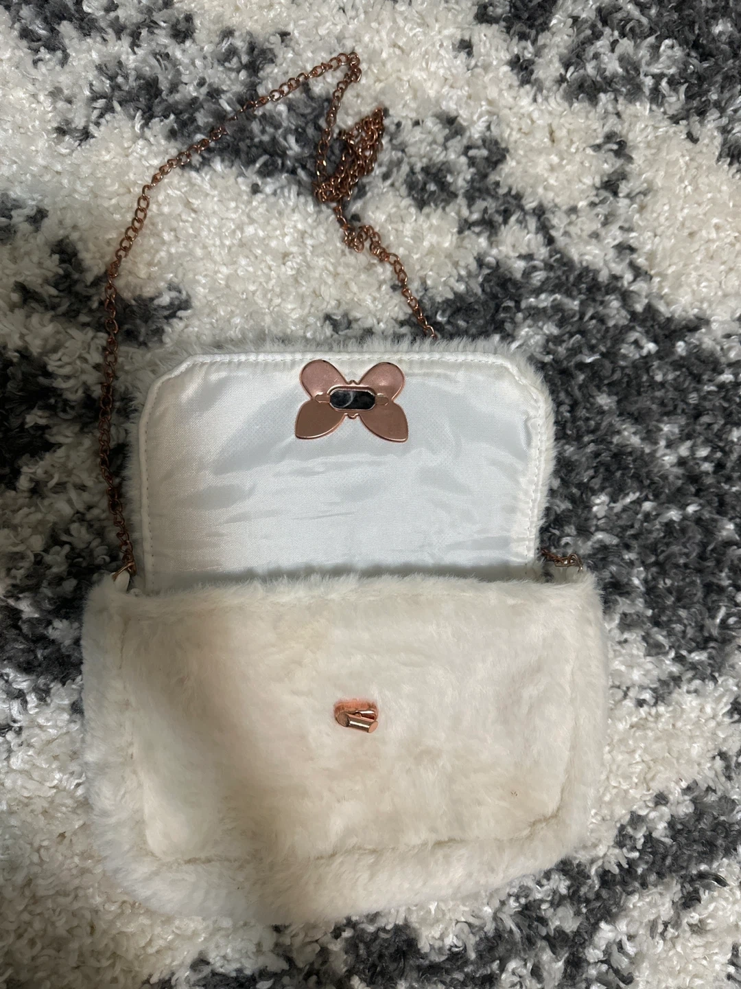 This cream fuzzy handbag features a rose gold butterfly clasp and chain strap. It's a cute accessory for nights out. Has a satin lining inside.