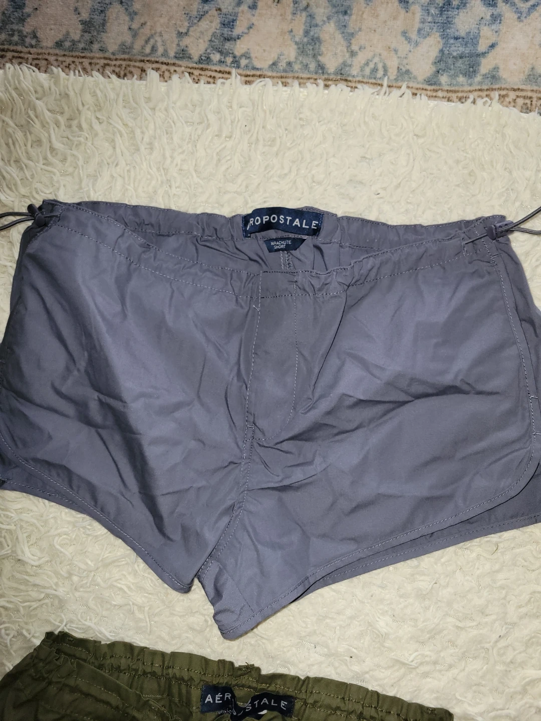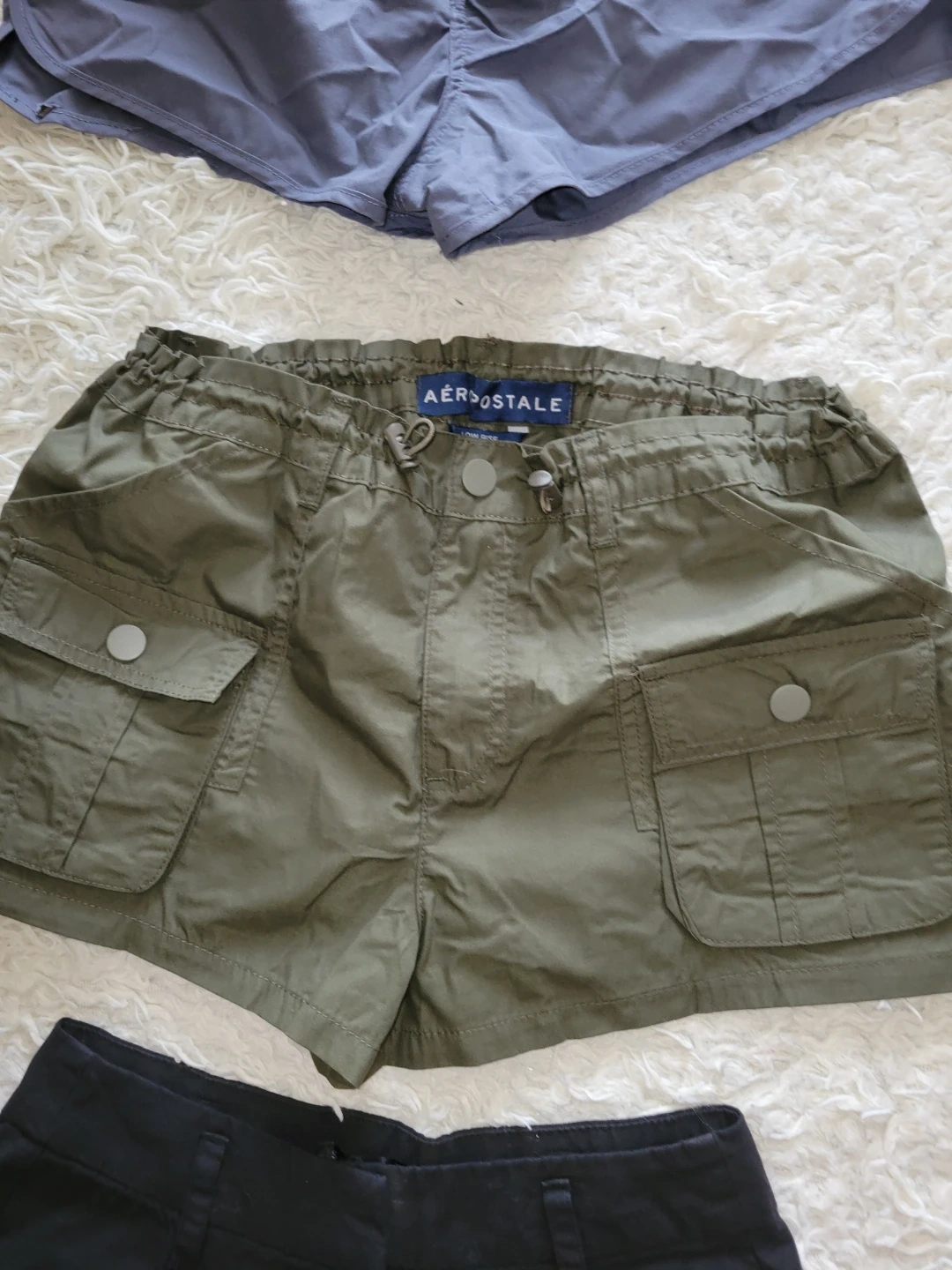 These Aeropostale shorts are a comfy cargo style in a versatile olive green. They feature an elastic waistband with a drawstring for a custom fit. Great for casual wear!