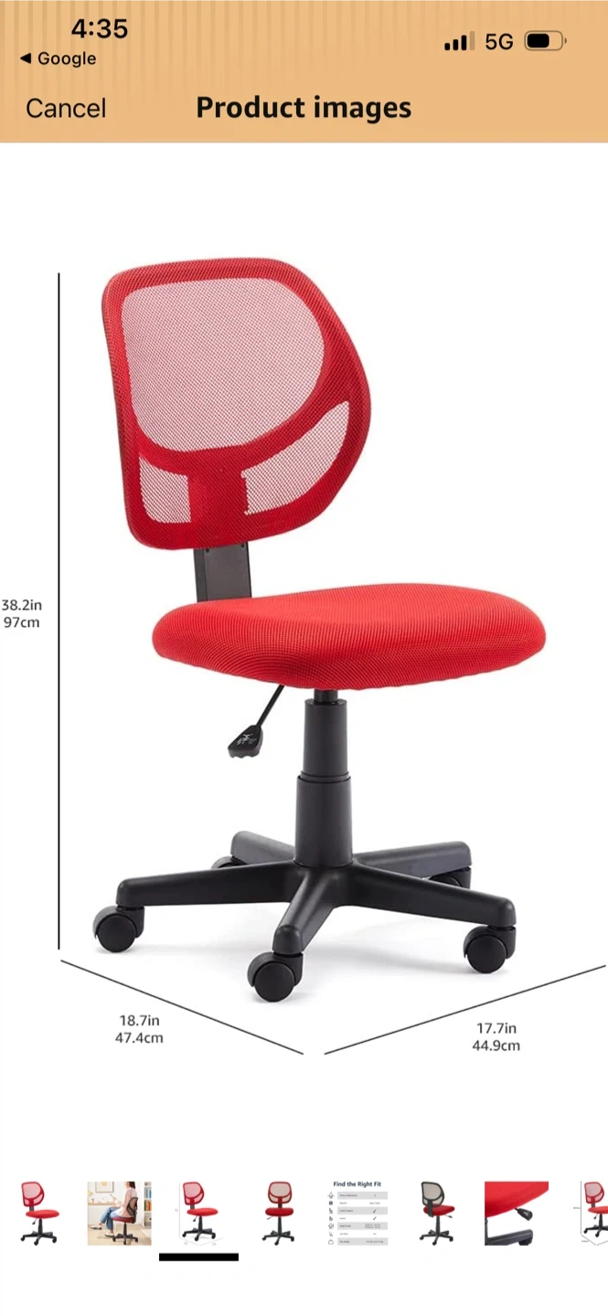 This is a red mesh back office chair with a fabric seat. It's adjustable and sits on a five-wheel base for easy mobility. Dimensions are 38.2in height, 18.7in width, and 17.7in depth.