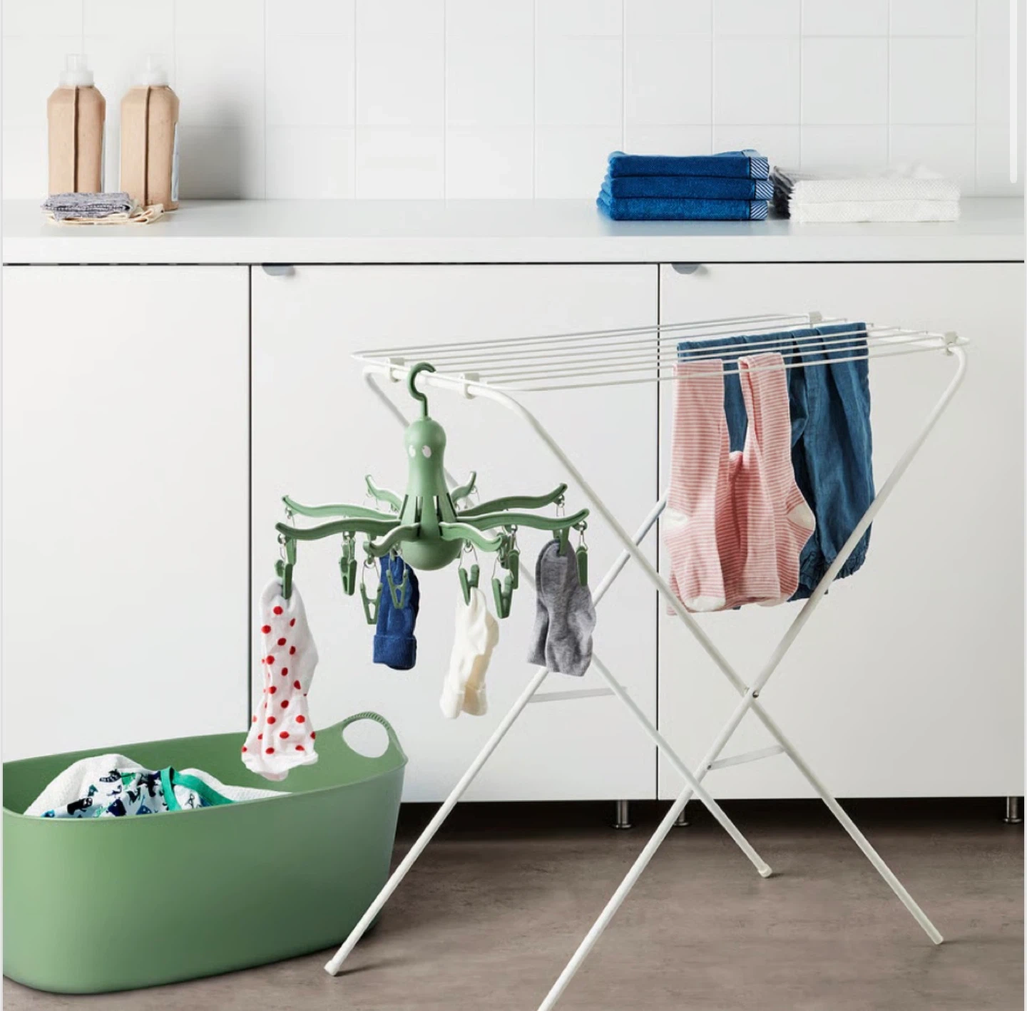 IKEA BUMERANG octopus-shaped clothes hanger. It's light blue and comes with 12 clips for hanging small items like socks and underwear. Perfect for small laundry spaces!