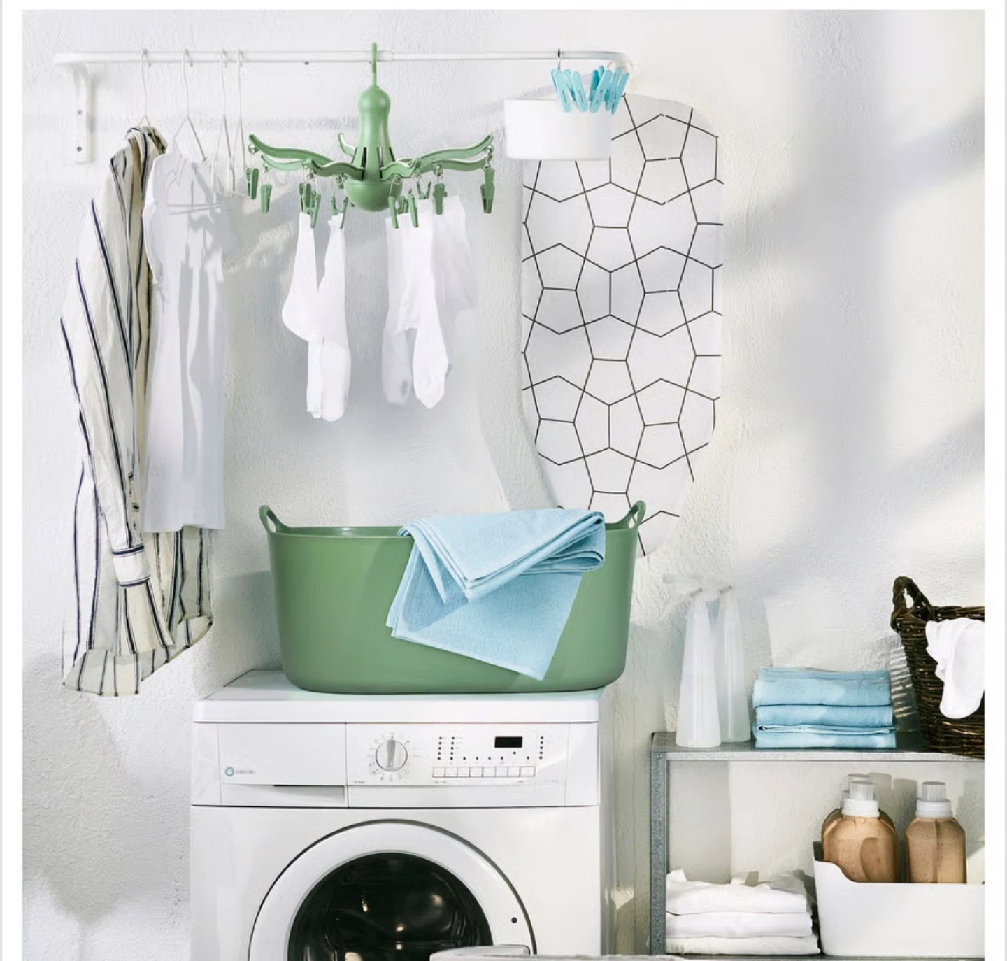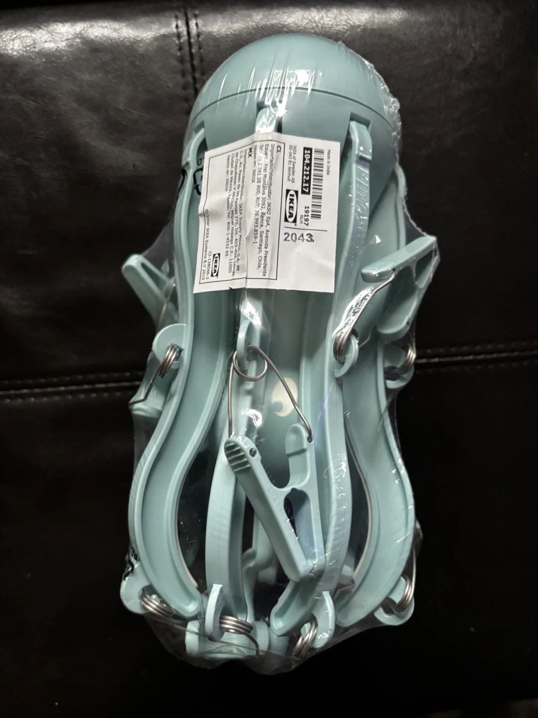 IKEA BUMERANG octopus-shaped clothes hanger. It's light blue and comes with 12 clips for hanging small items like socks and underwear. Perfect for small laundry spaces!