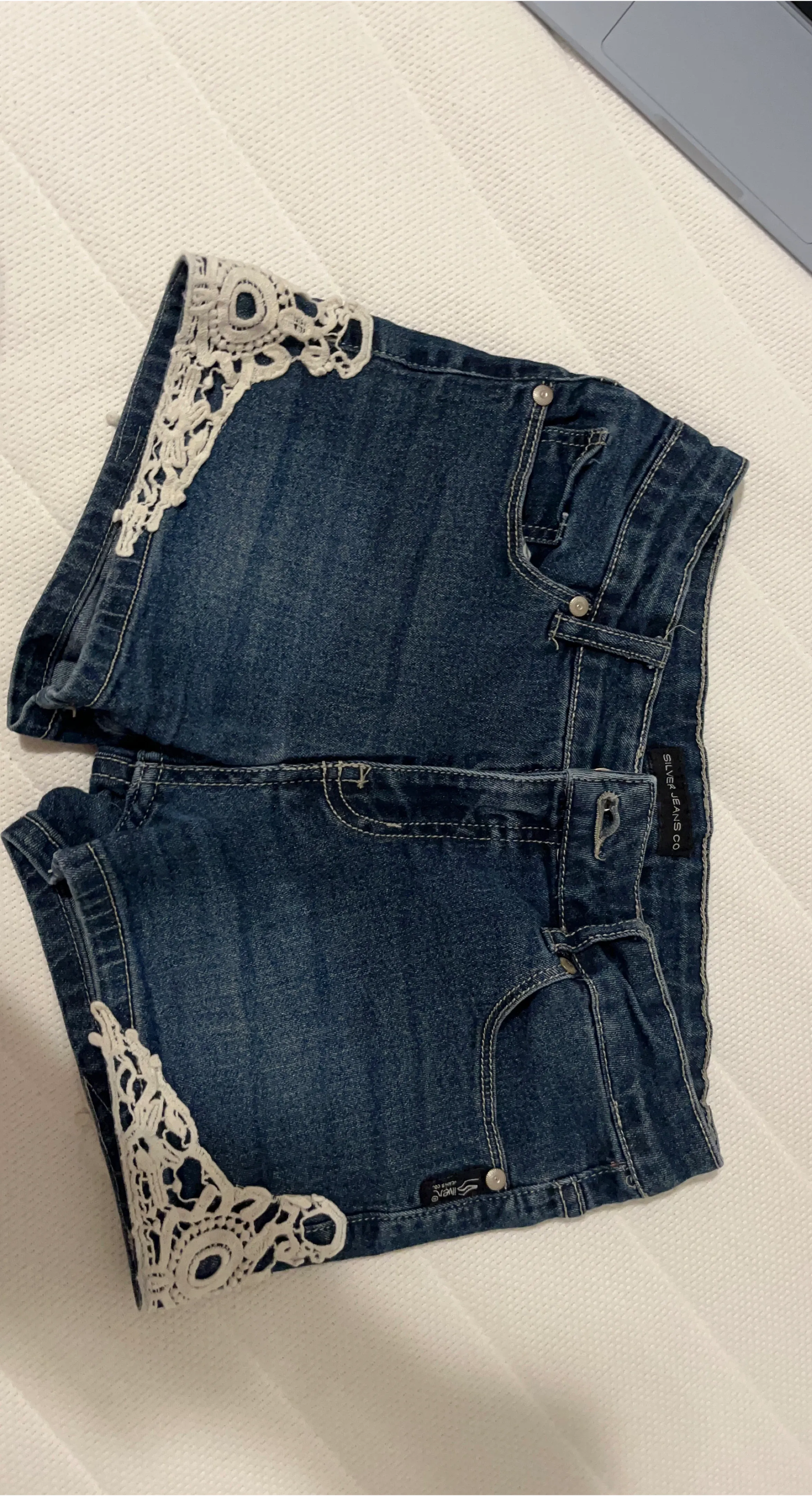 Cute denim shorts with intricate lace detailing on the pockets. Made by Silver Jeans Co. These shorts are a stylish addition to any summer wardrobe!