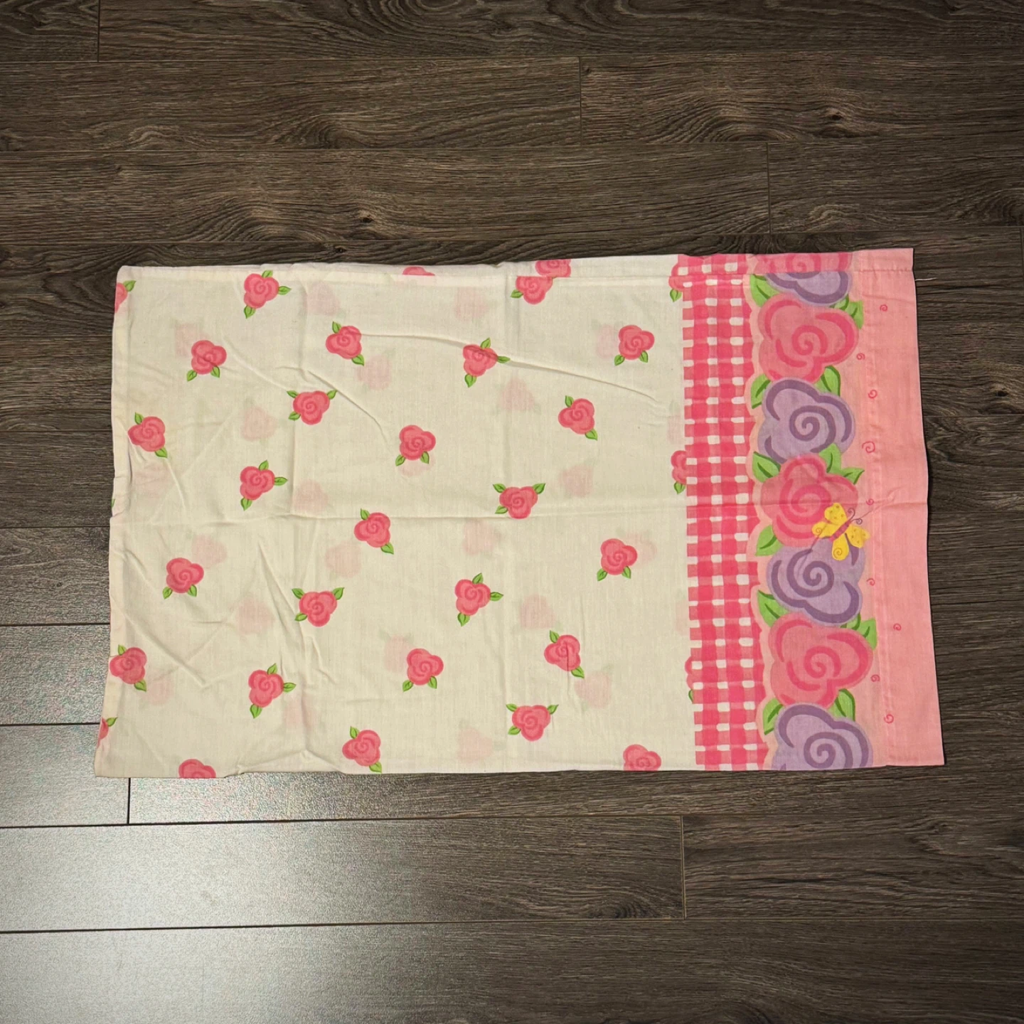 cute pillowcase with a floral print! It has a white background with pink roses scattered across it. The edge has a pink and white checkered border with larger pink and purple floral designs. It's in great condition and ready for a new home.