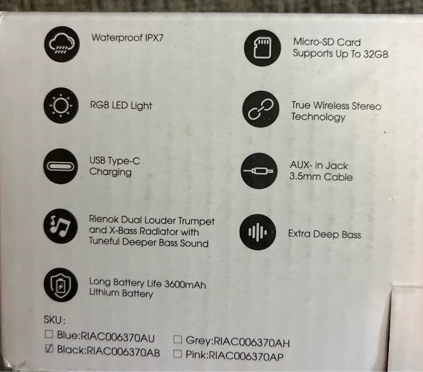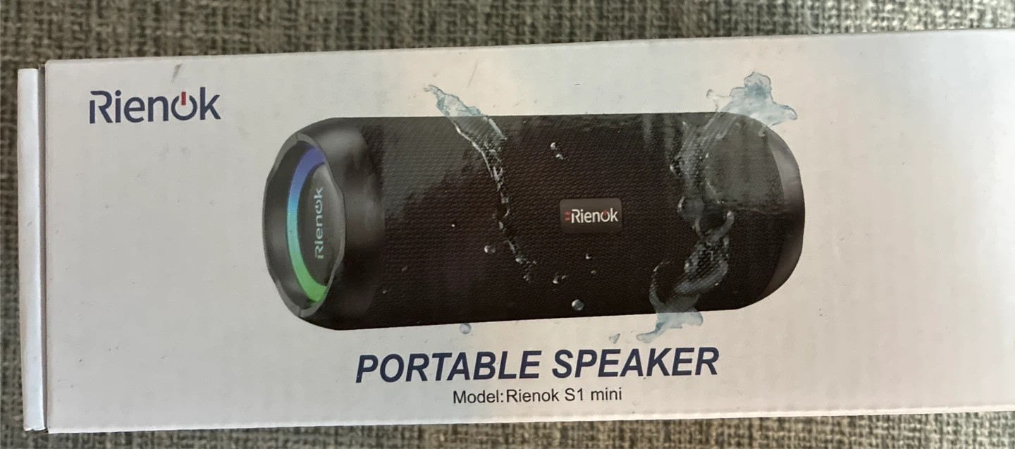 This is a brand new in the box Rienok Model S1 Mini portable Bluetooth speaker. It's waterproof with an IPX7 rating and supports Micro-SD cards up to 32GB. Features include RGB LED lights, USB Type-C charging, and a 3600mAh lithium battery for long life.