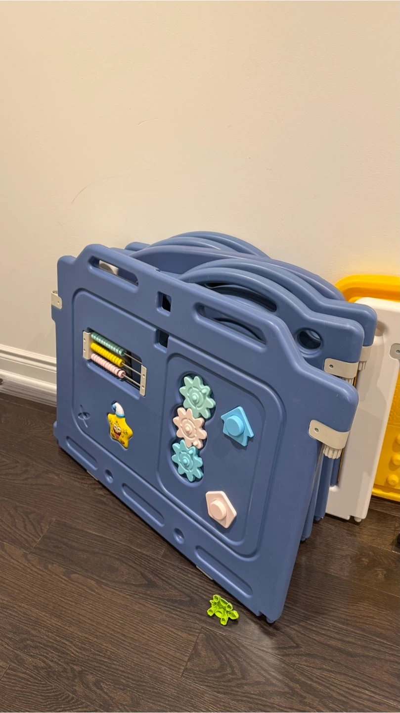 Selling a gently used kids' playpen with a slide and swing set! This set is perfect for keeping your little ones entertained and safe. The playpen is a lovely blue colour and includes interactive features. It also comes with a slide and swing set for even more fun!