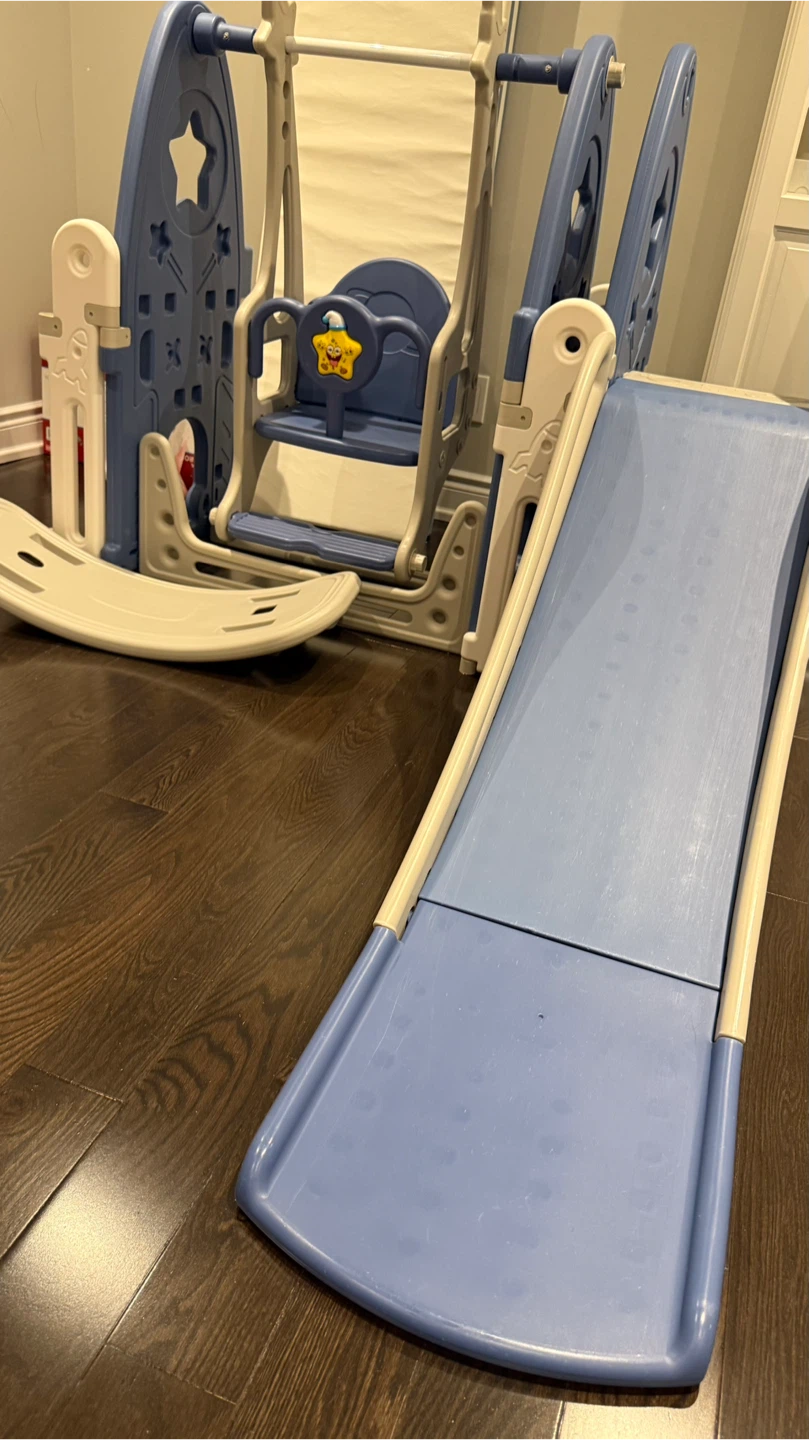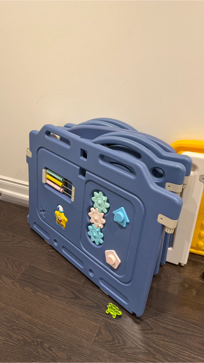 Selling a gently used kids' playpen with a slide and swing set! This set is perfect for keeping your little ones entertained and safe. The playpen is a lovely blue colour and includes interactive features. It also comes with a slide and swing set for even more fun!