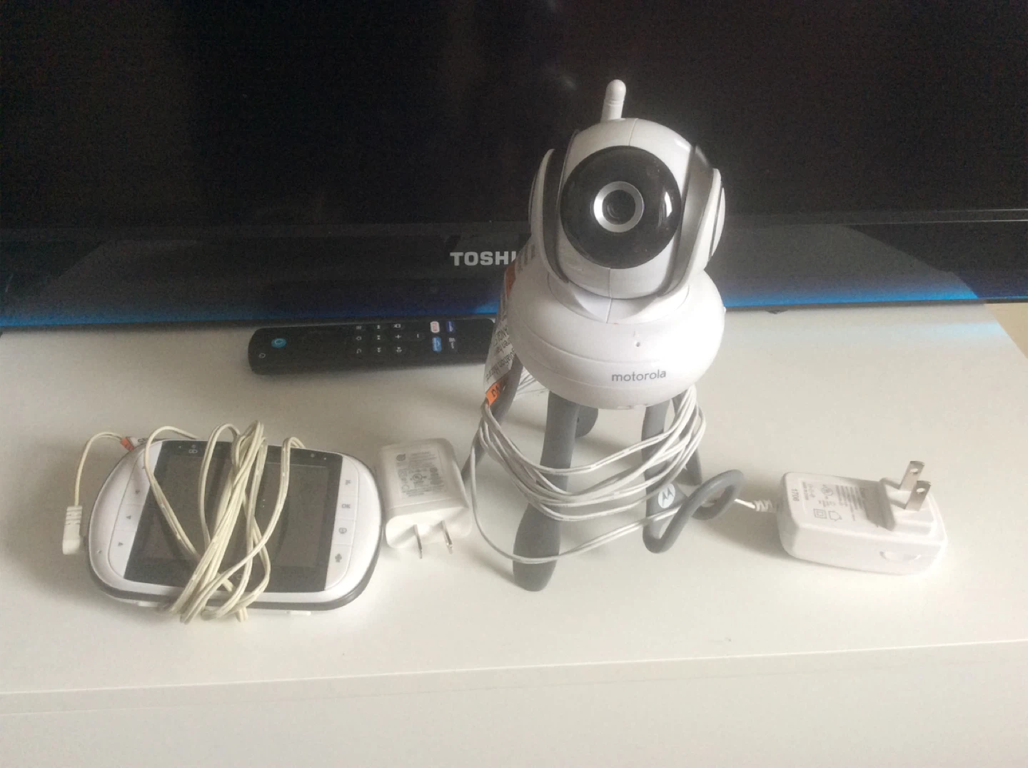 This is a Motorola MBP36 baby monitor. It comes with the parent unit, camera, and two power adapters. The camera has a tripod stand and can pan and tilt.