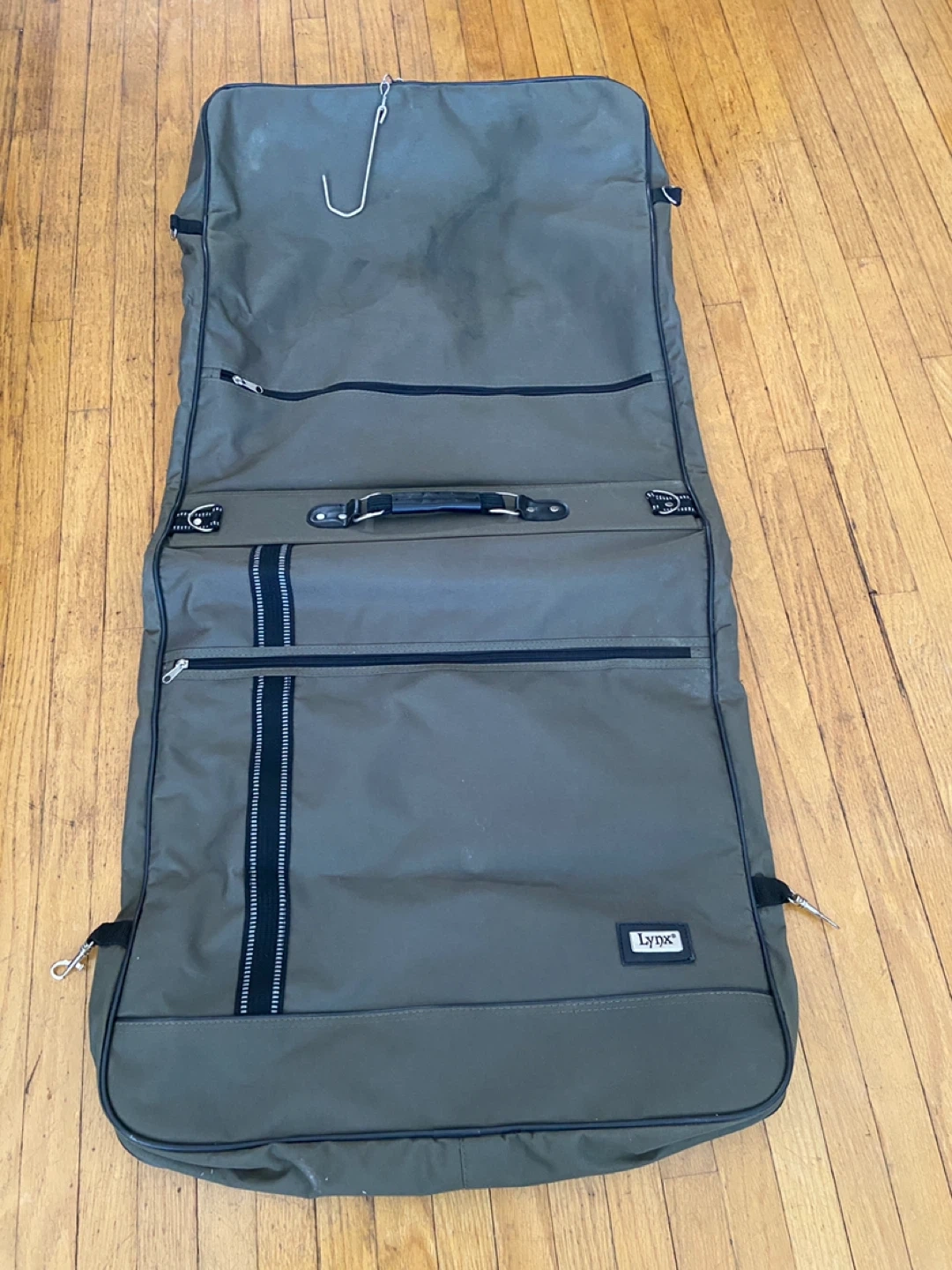 This is a Lynx garment bag. It's a foldable bag with multiple zippered compartments. It has a durable exterior and carrying handles for easy transport.