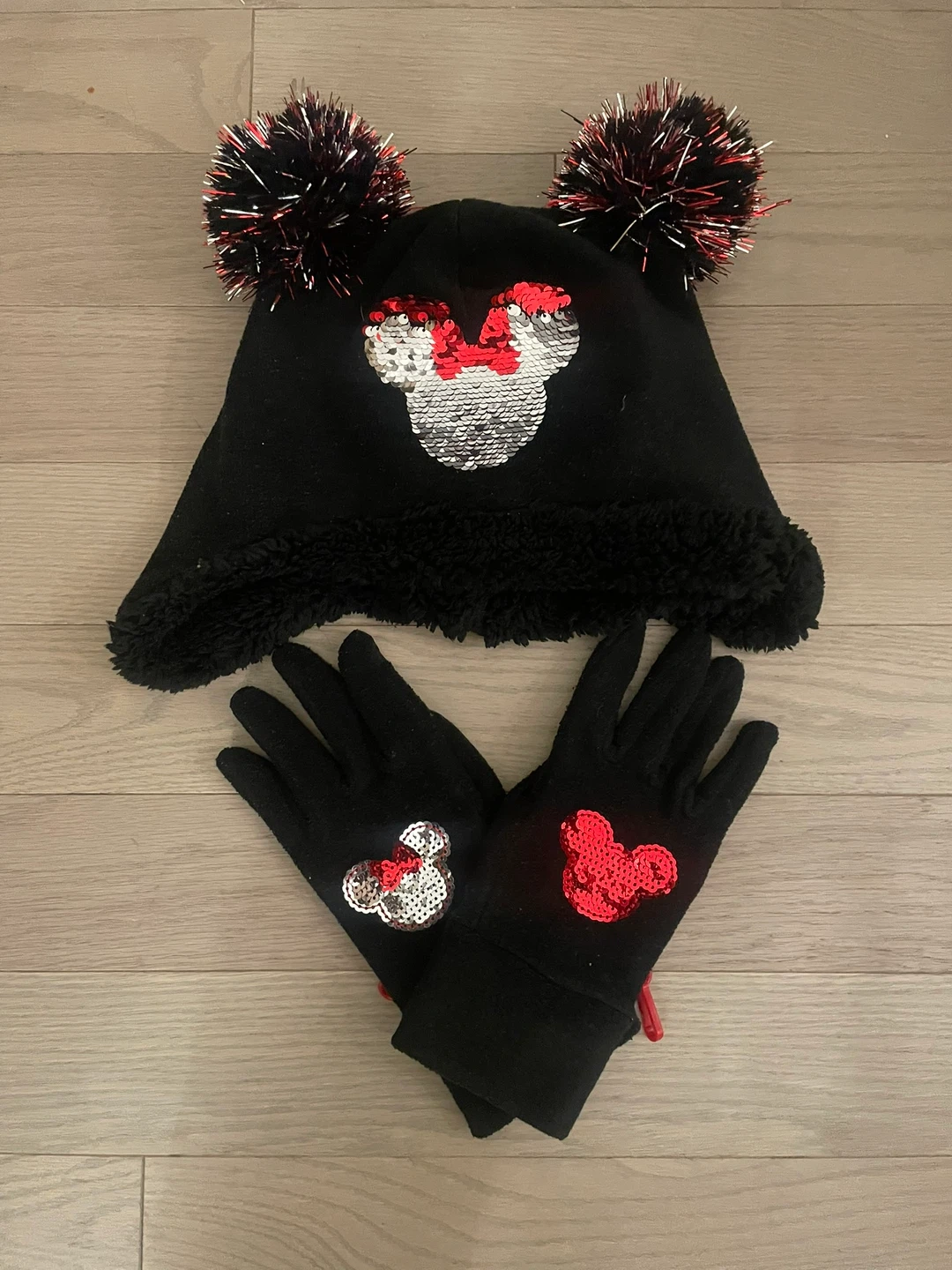 This cozy set features a black hat with fuzzy trim and two pom-poms, adorned with a sequined Minnie Mouse face. It also includes a pair of black gloves, each with a sequined Minnie Mouse design. It's a fun and warm accessory set!
