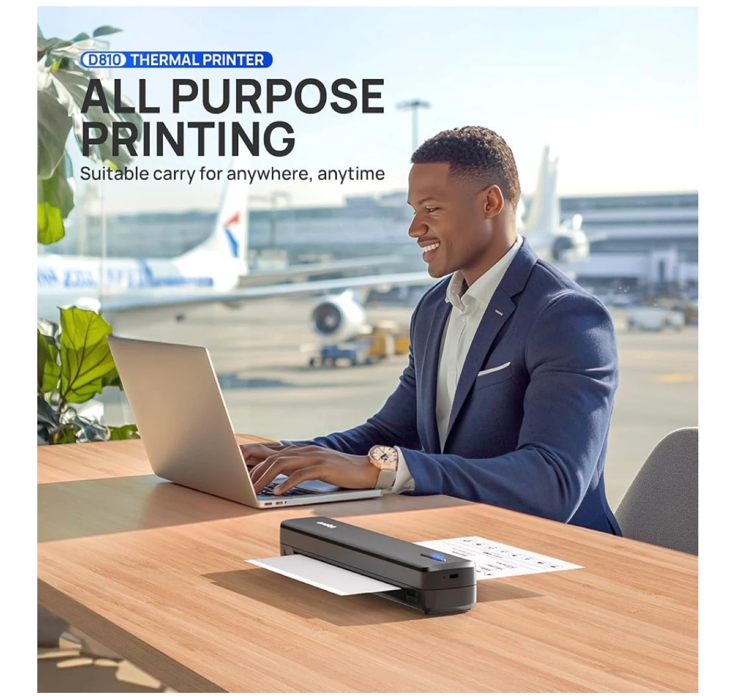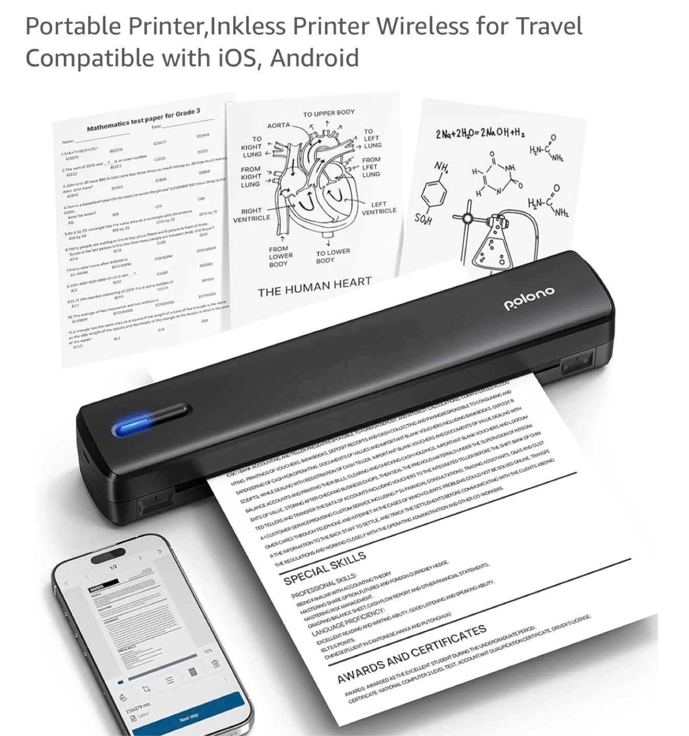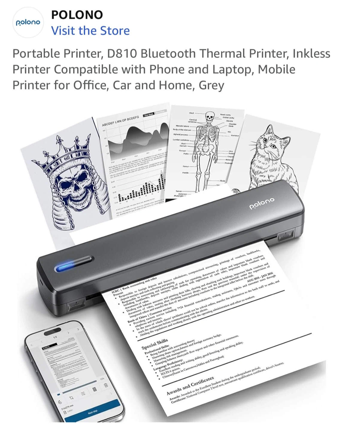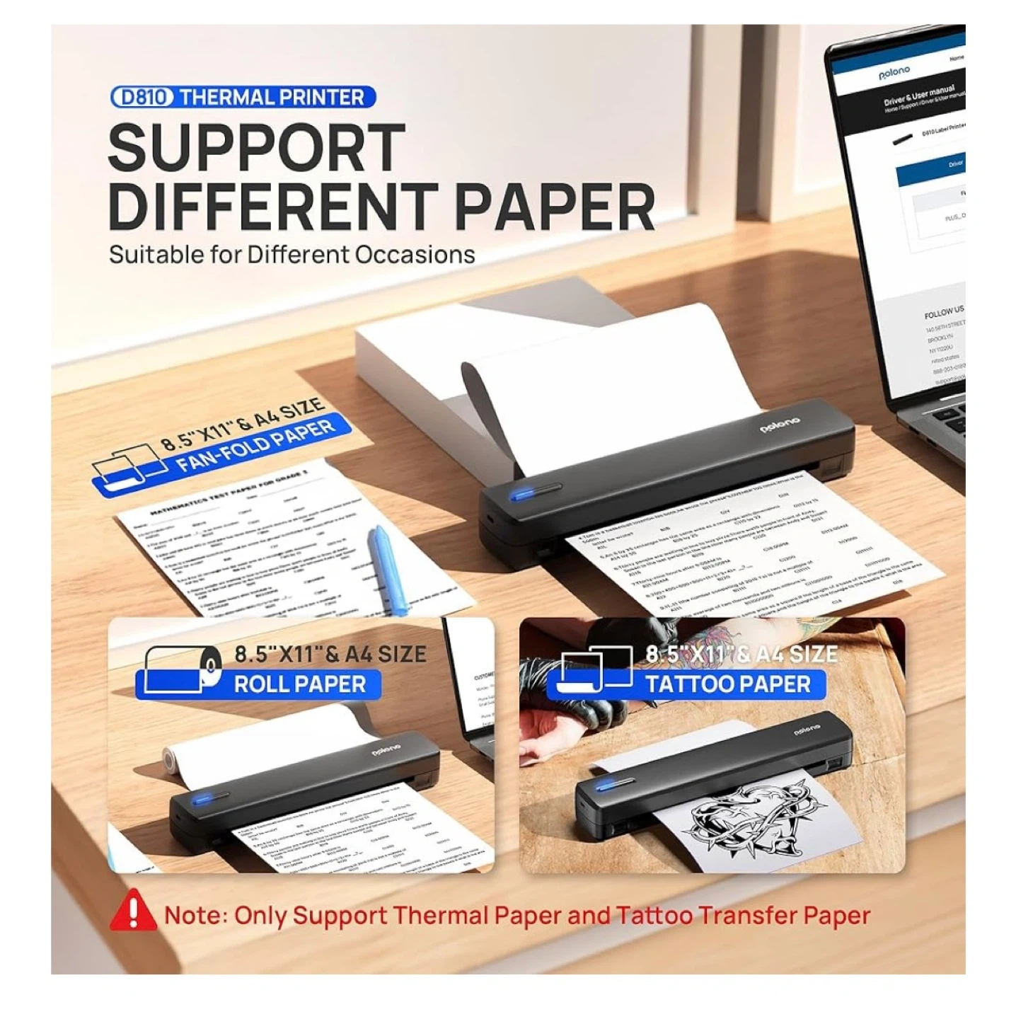 Looking to print on the go? This Polono D810 Bluetooth Thermal Printer is perfect for home, office, or even your car! It's an inkless printer that's compatible with phones and laptops. It supports various paper types, including roll paper, fan-fold paper, and tattoo transfer paper. Note that it requires a USB cord for printing and doesn't support Bluetooth printing.