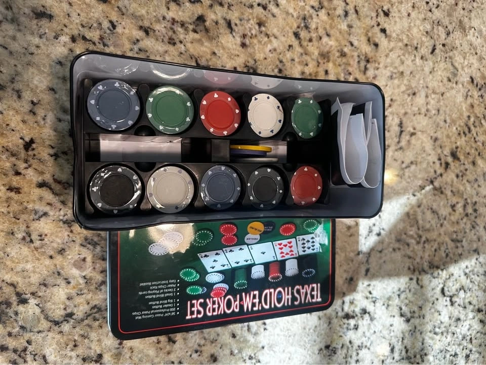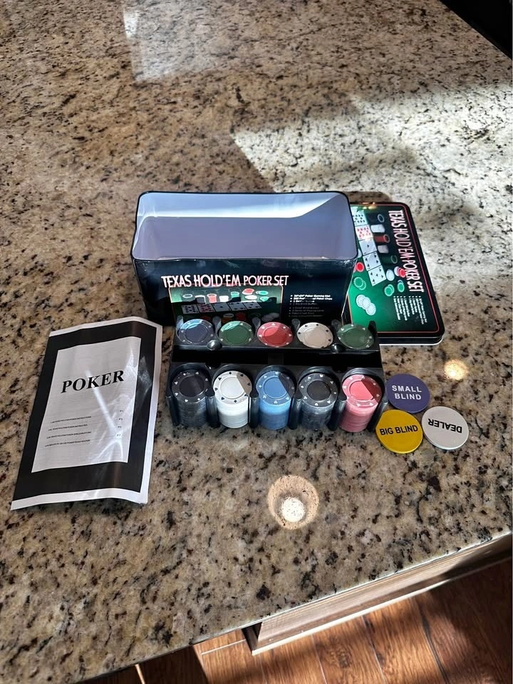 200 poker chips, new in packaging. Includes Big blind, small blind, and dealer chip. Comes in a metal case. No cards or mat included. Pickup only.