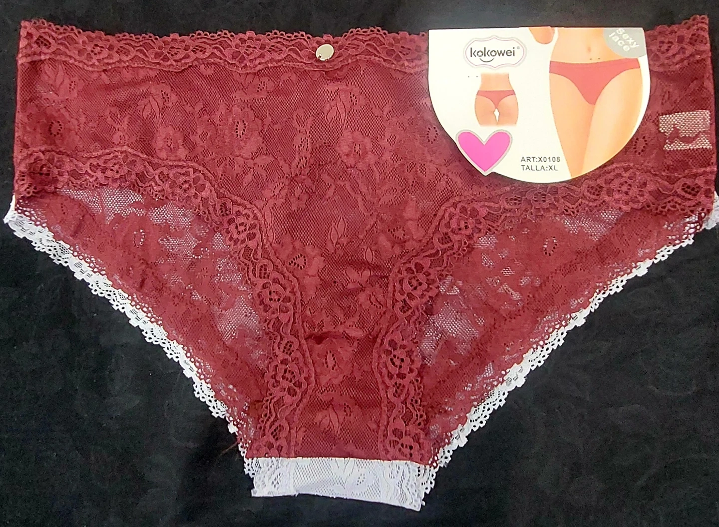 These Kokowei hipster panties are made with a beautiful all-over lace design. They feature a comfortable stretch fit and a decorative lace trim. Size XL.