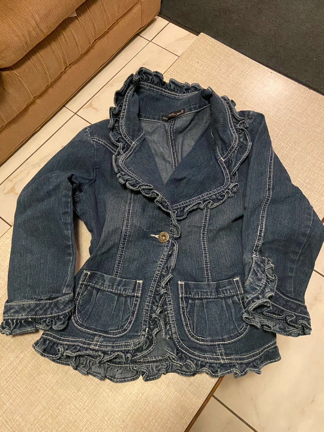 This is a cute blue denim jacket with ruffled details along the collar, cuffs, and hem. It features two front pockets and a single button closure. Denim material.
