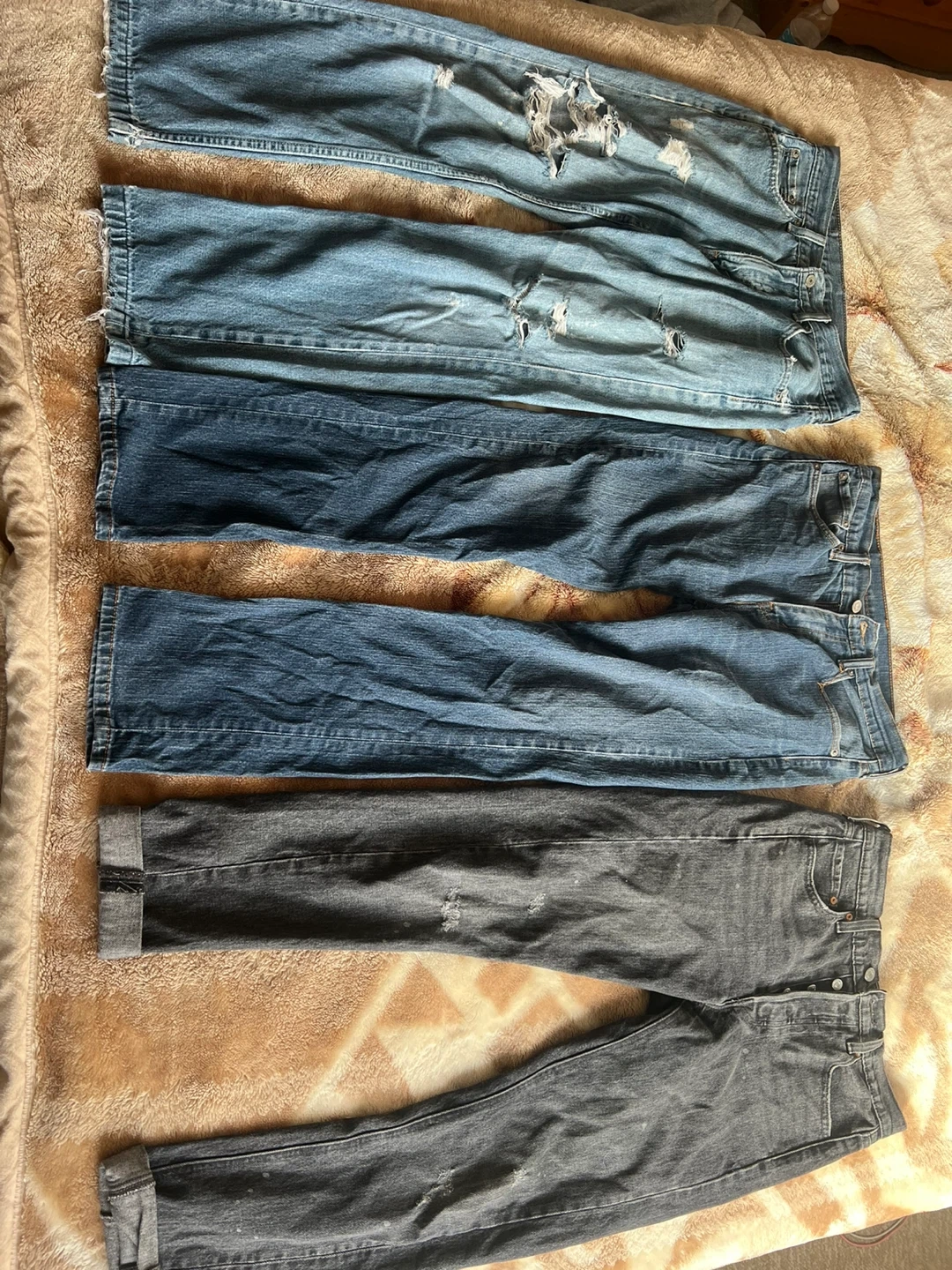 Bundle includes three pairs of Levi's jeans. Two pairs are classic blue denim, and one pair is dark grey wash. All are button-fly style. Good for everyday wear!