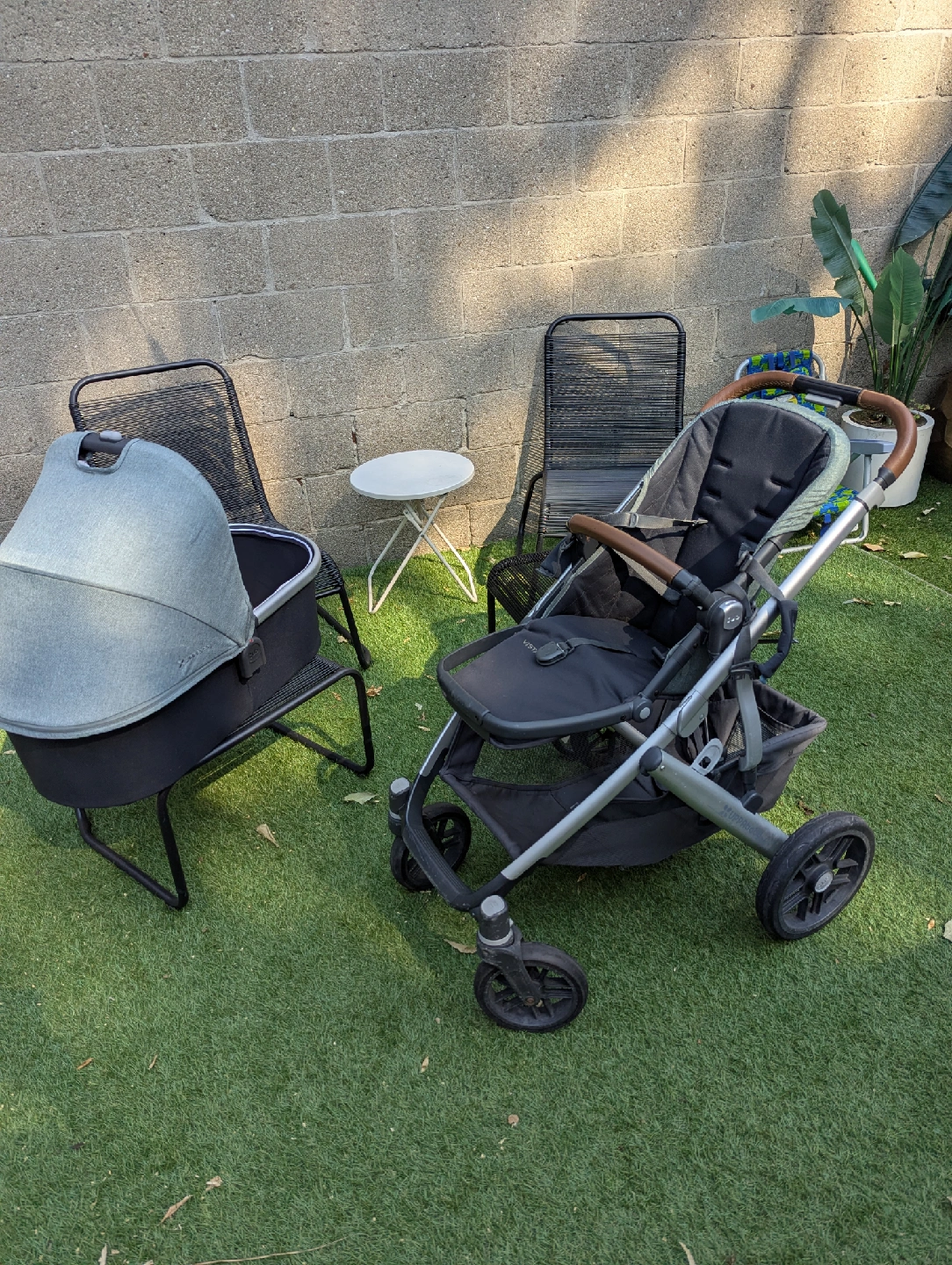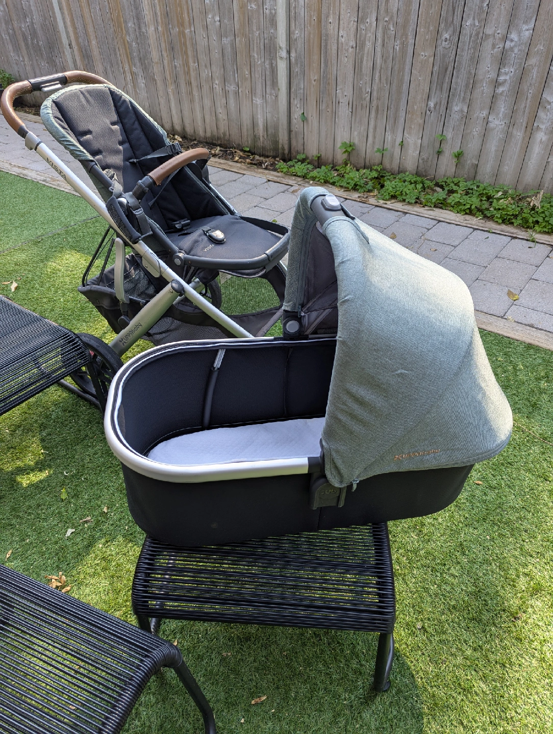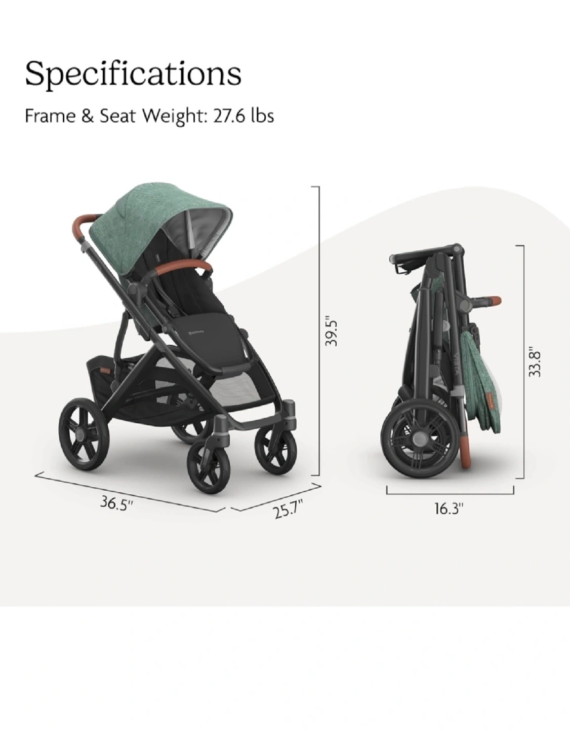 Selling an UPPAbaby Vista V2 stroller with the bassinet attachment! this is the version with the beautiful green fabric and tan leather handles. The stroller is in great condition and ready for a new family. Frame and seat weight is 27.6 lbs. Dimensions when unfolded are 36.5" x 39.5" x 25.7" and when folded are 16.3" x 33.8".