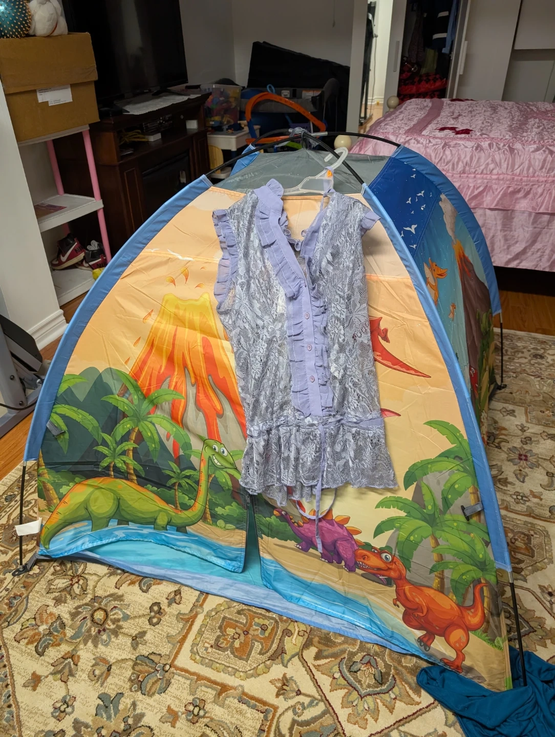 This listing includes two women's tops. One is a black lace sleeveless top. The other is a light purple lace blouse with ruffled details and buttons down the front. Both tops are made of lace material.
