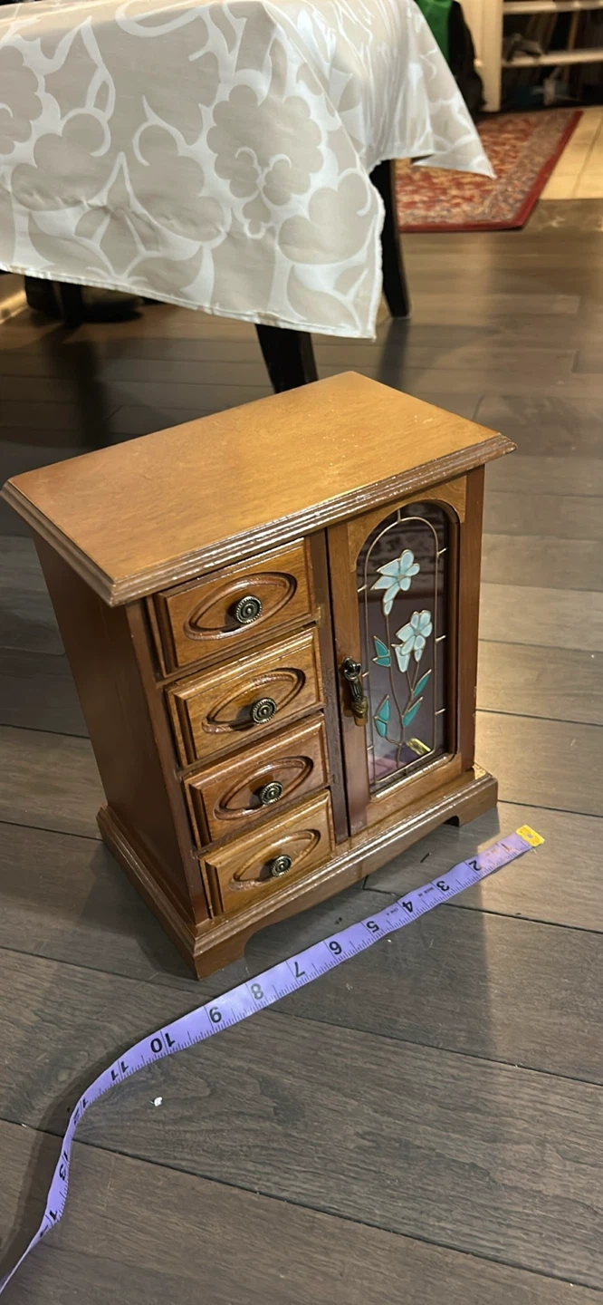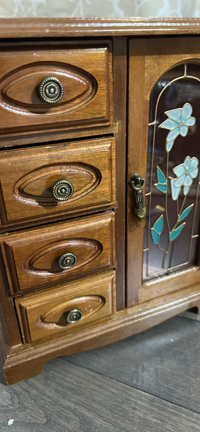 This vintage-style wooden jewelry box features a decorative stained glass door with floral accents. It has four drawers and a small cabinet for storing accessories. Wood material.
