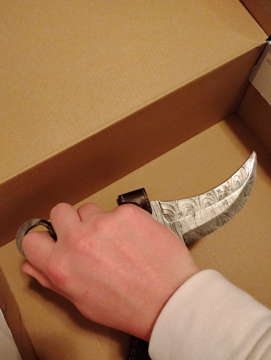 This karambit-style knife features a Damascus pattern blade and a wood handle. It comes with a brown leather sheath. Useful for outdoor activities or as a collector's item.
