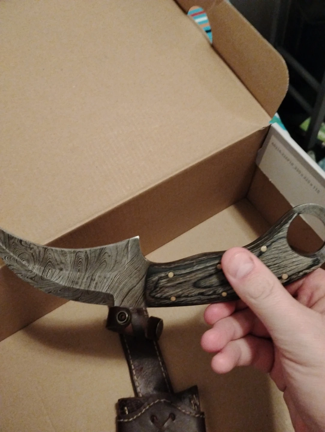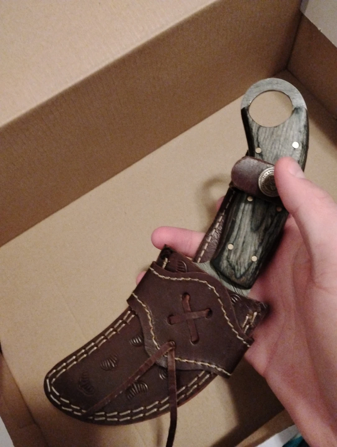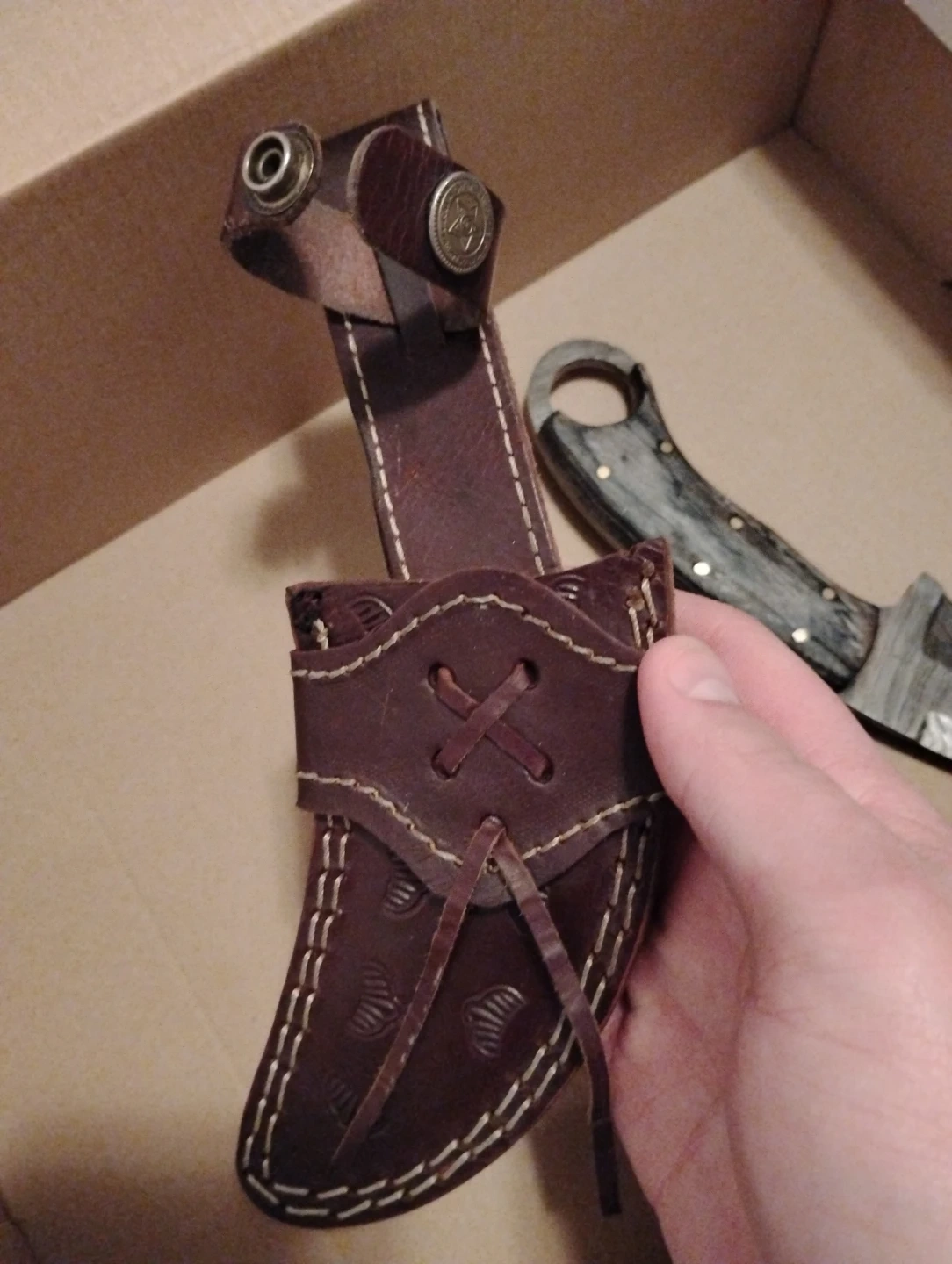 This karambit-style knife features a Damascus pattern blade and a wood handle. It comes with a brown leather sheath. Useful for outdoor activities or as a collector's item.