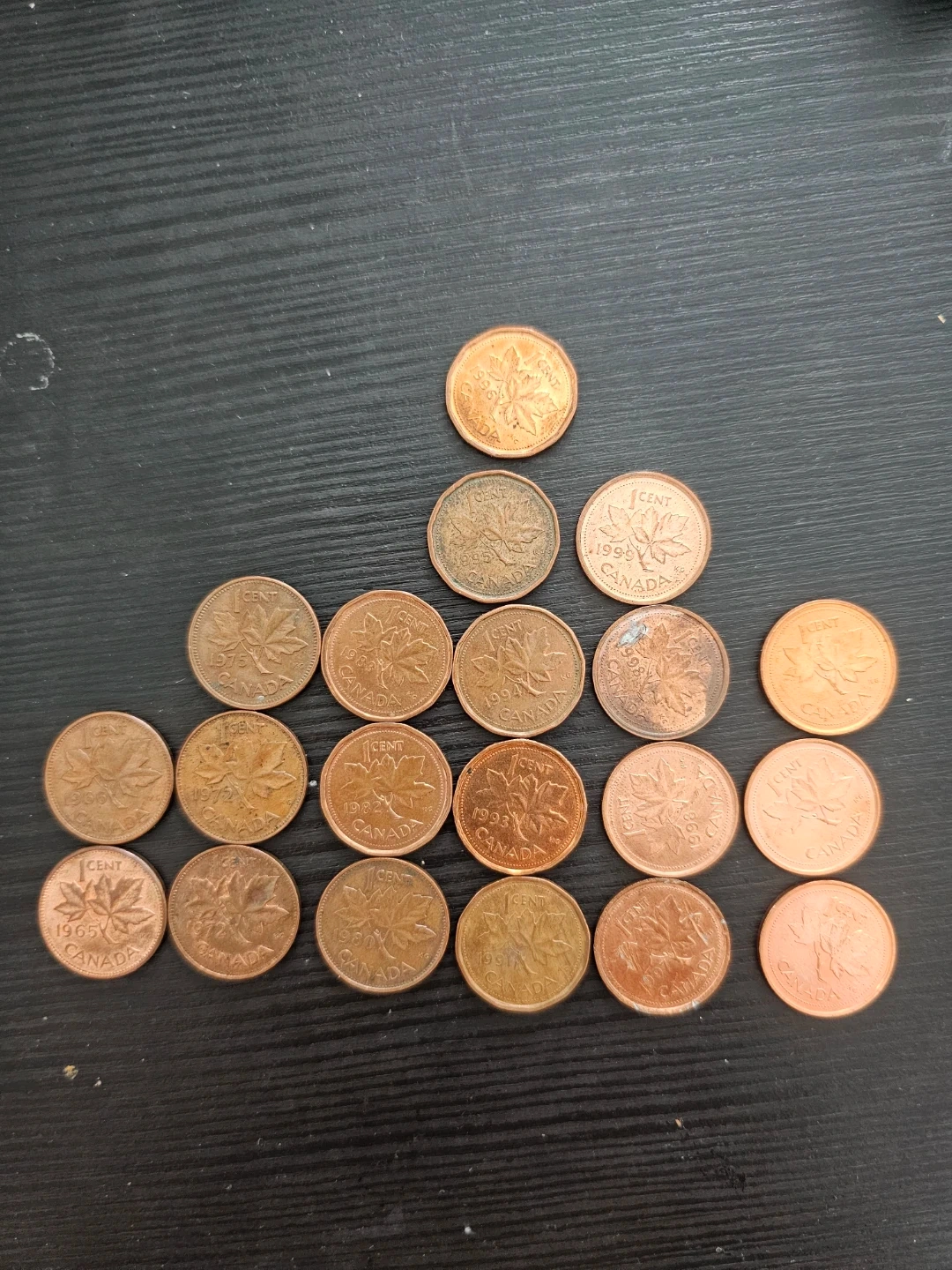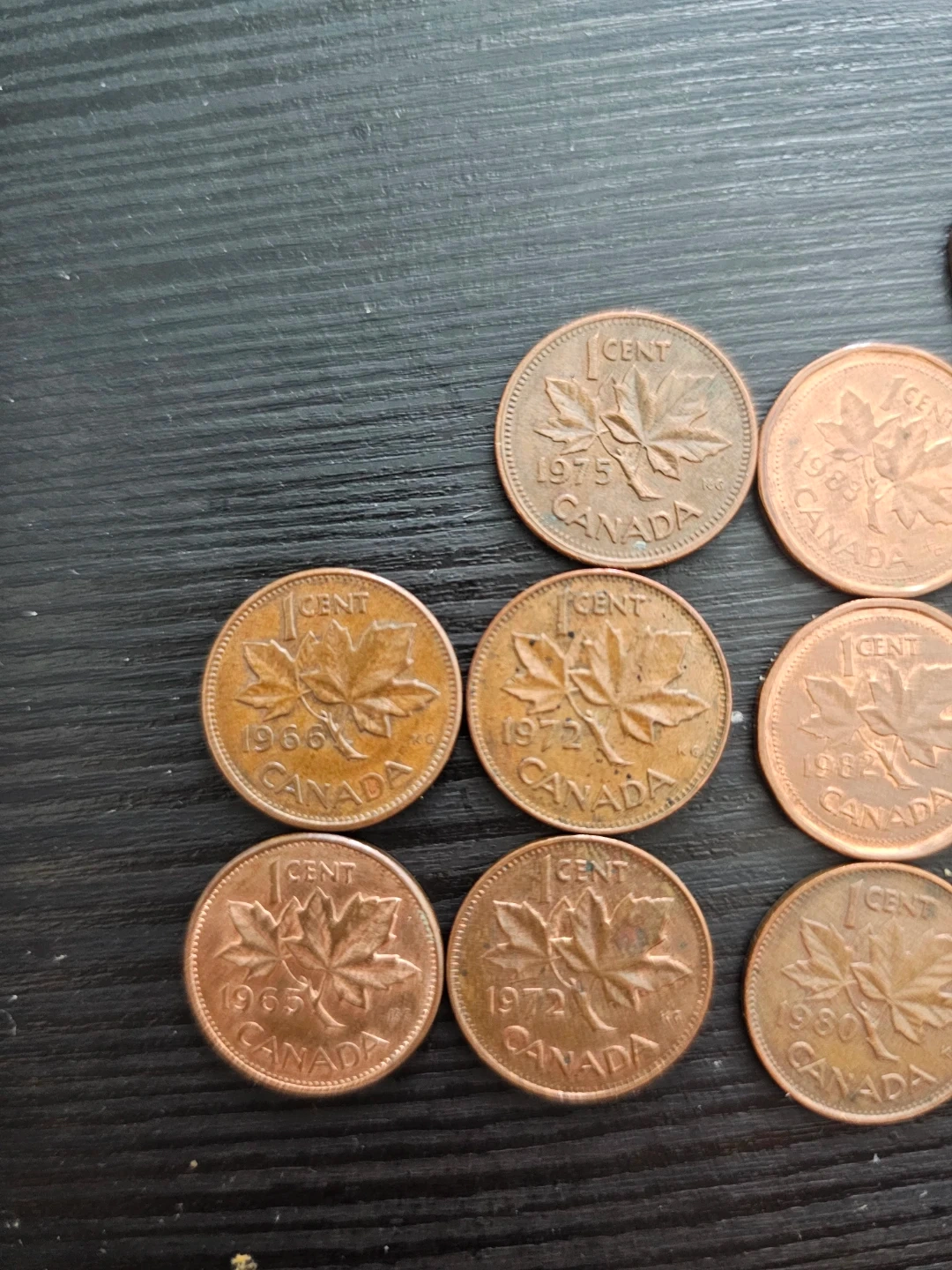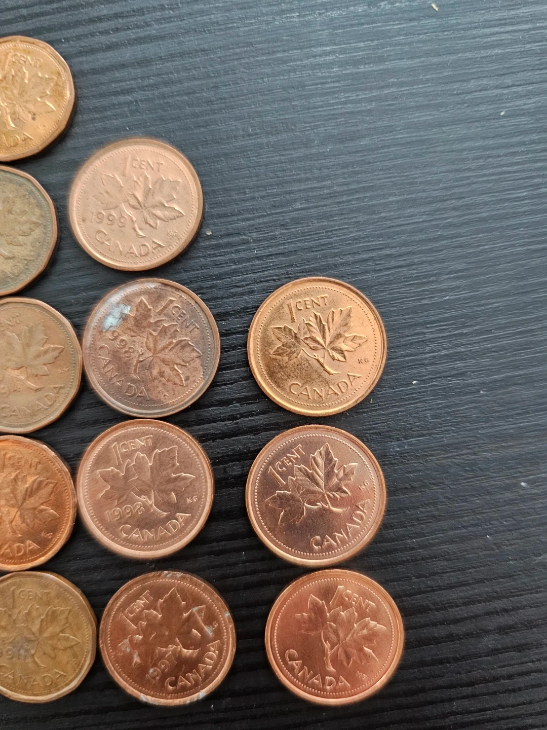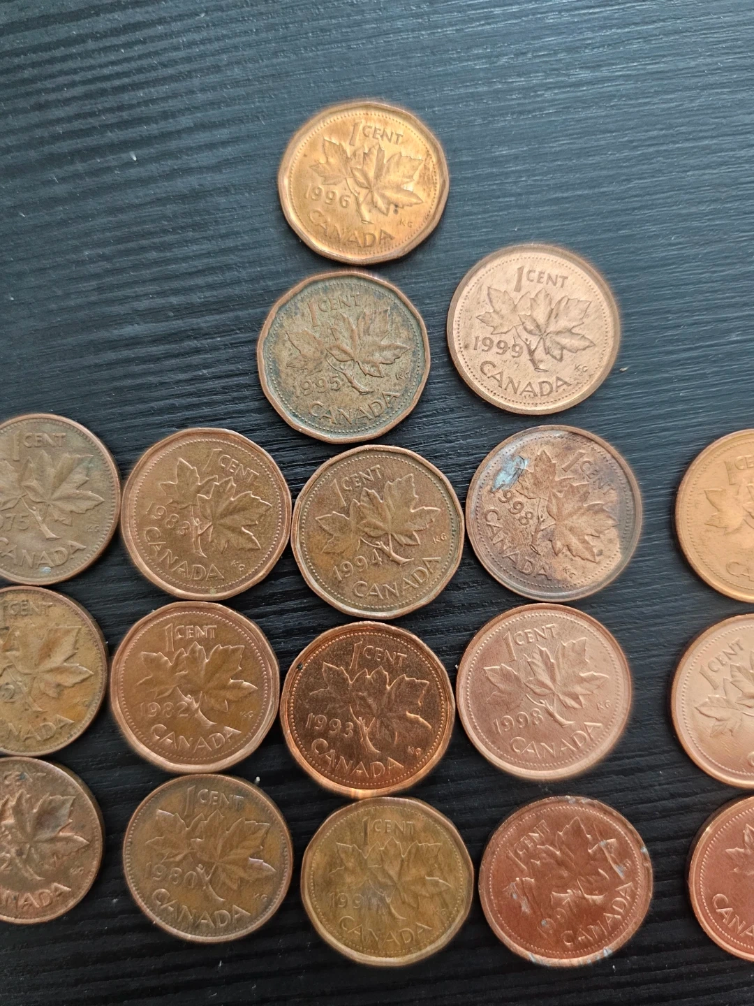 A collection of Canadian one cent coins featuring maple leaves. Various years are present, including 1965, 1972, 1975, 1982, 1983, 1993, 1994, 1995, and 1996. These coins are made of copper.