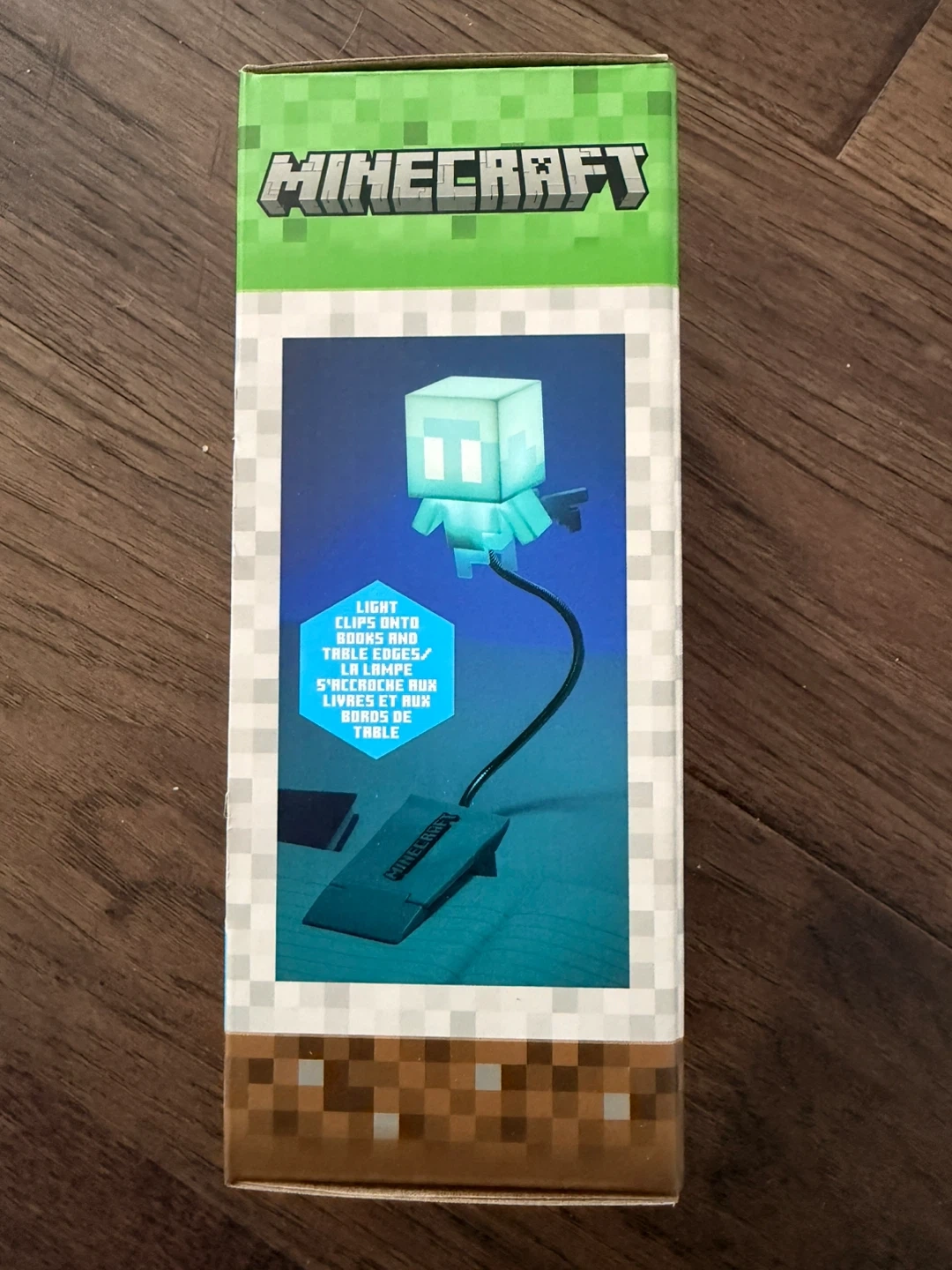 Here's a Minecraft Allay clip-on book light by Paladone! It clips onto books and table edges. The cable is flexible, and it has 3 light modes. Hard to find and perfect for any Minecraft fans.