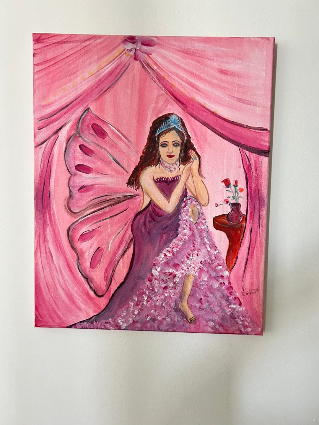 Beautiful pink fairy painting. Acrylic on canvas. Features a fairy in a pink dress with butterfly wings. Unique artwork. Great for home décor.