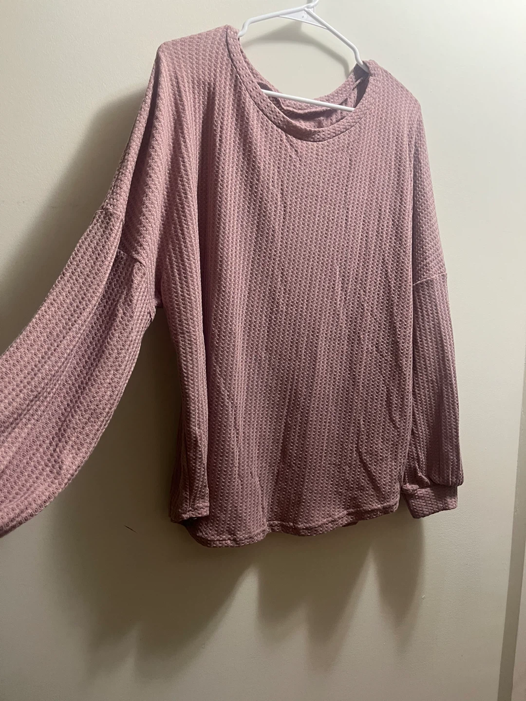 Selling a comfy pink waffle knit long sleeve top! It's in great condition and perfect for layering or wearing on its own. The material is soft and cozy, making it ideal for cooler weather.