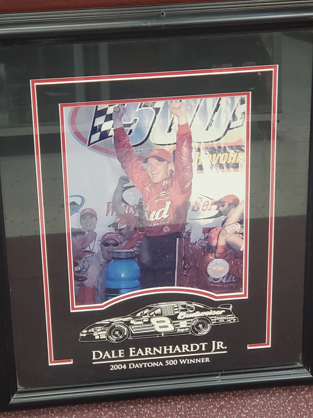 Framed picture of Dale Earnhardt Jr. winning the 2004 Daytona 500. Features Budweiser and Snap-on logos. Perfect for any racing fan!